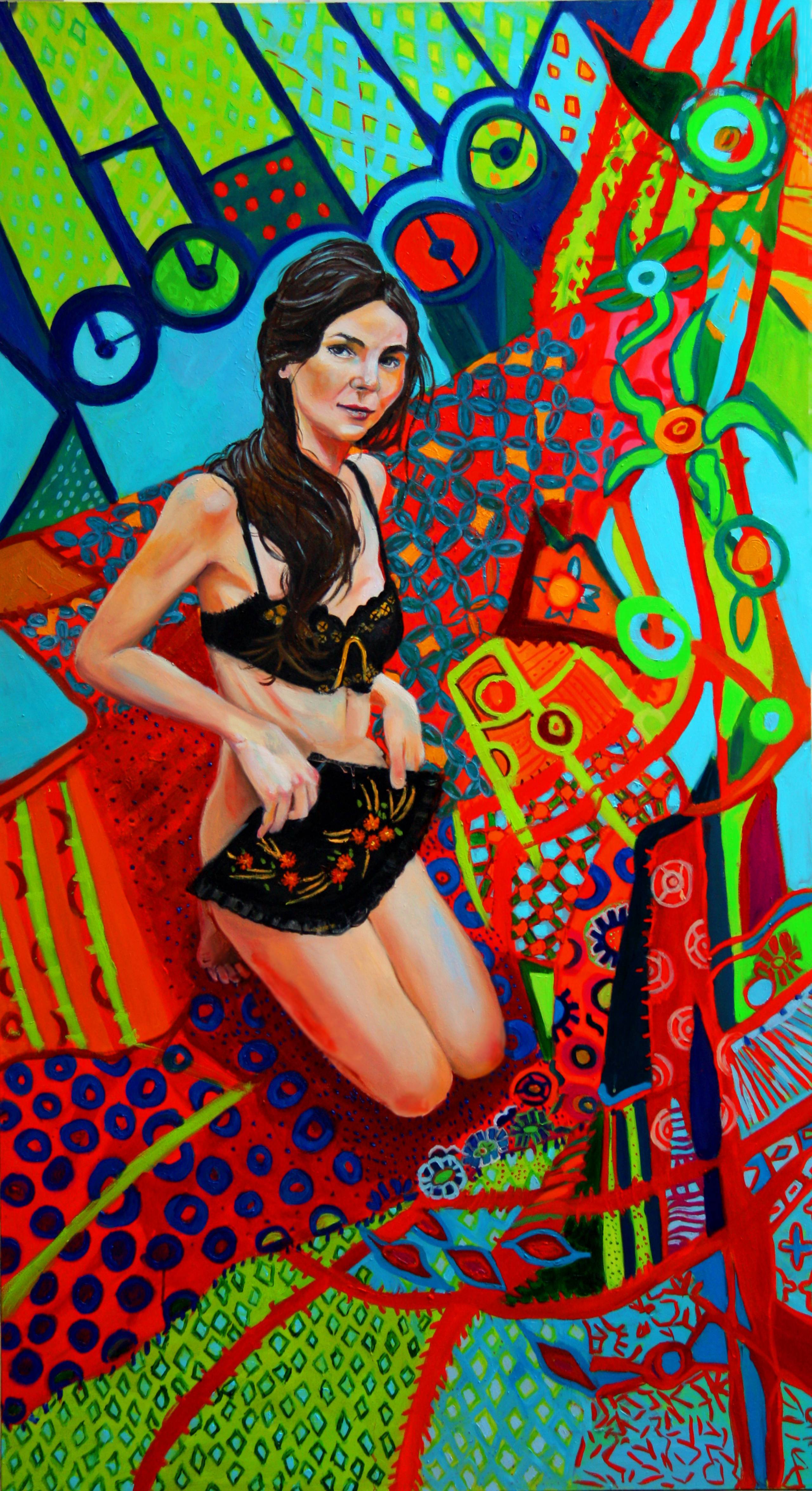 Obraz emanuje feerią barw i wzorów, które razem tworzą dynamiczną kompozycję. Intensywne czerwienie, zielenie, niebieski i pomarańczowy przenikają się, tworząc tło pełne energii i ruchu. Na pierwszym planie znajduje się kobieca postać, ubrana w ciemne stroje ozdobione delikatnymi wzorami. Jej oczy zdają się patrzeć prosto na widza, jakby zapraszając do bliższego przyjrzenia się tej artystycznej układance. Nastrój obrazu jest jednocześnie żywiołowy i enigmatyczny. Kolorystyka podkreśla atmosferę tajemnicy, a nieporządek form nasuwa myśl o chaosie, który jest jednak kontrolowany. Styl artysty można zaklasyfikować jako współczesny z elementami abstrakcji, gdzie zastosowano odważne pociągnięcia pędzla i intensywne kolory. To little bit crazy, ale też fascynujące. Patrząc na obraz, można poczuć mieszankę fascynacji i zagubienia. Dla mnie to jak podróż do świata, gdzie wszystko jest możliwe. Czy to sen, czy jawa? 7-letnie dziecko powiedziałoby pewnie: „Wow, ale tu jest kolorowo!”. Emocje, które budzi to dzieło, to radość z eksploracji i odkrywanie nowych detali za każdym spojrzeniem.