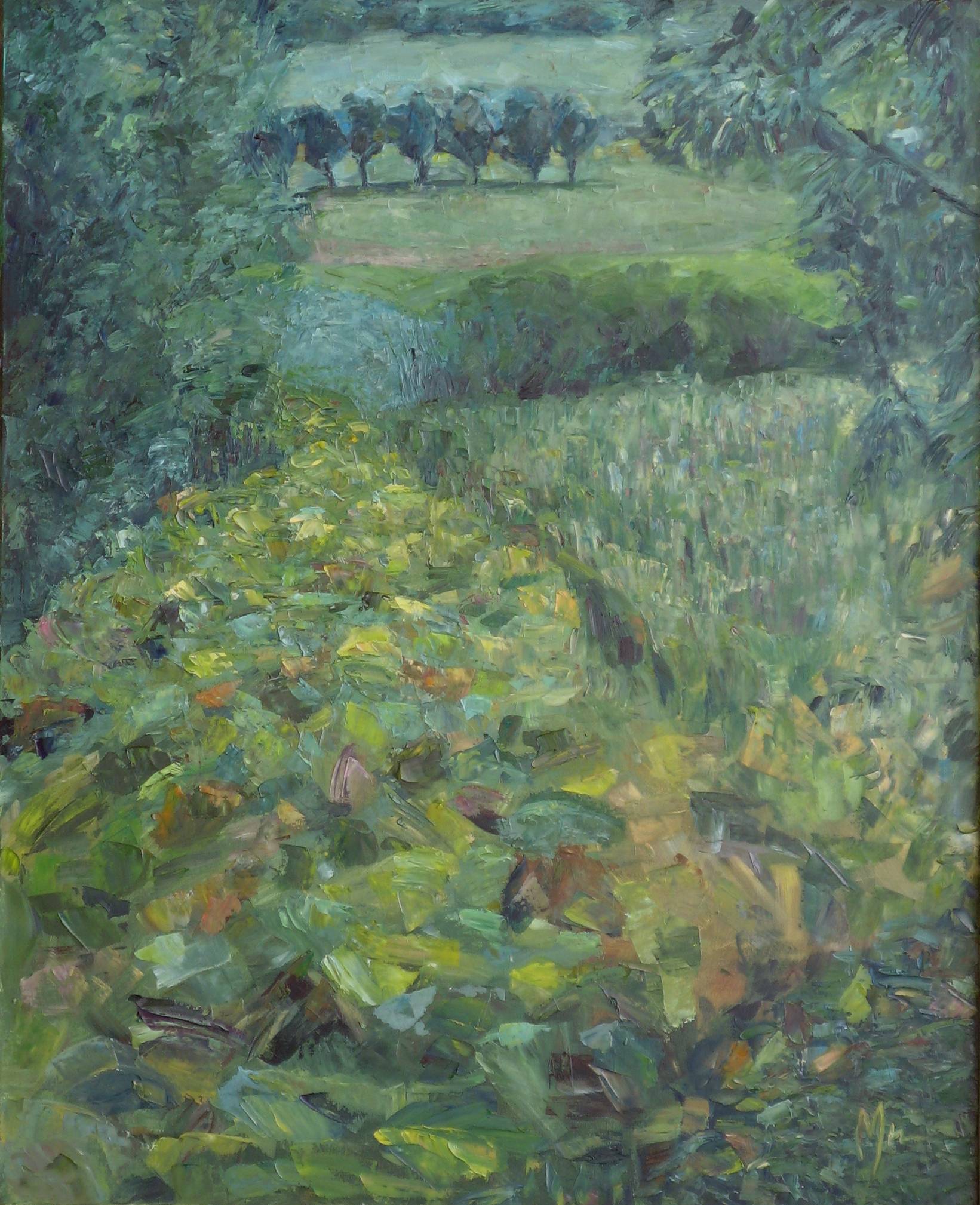 Obraz przedstawia rozległy krajobraz, pełen soczystej zieleni, aż bije po oczach. Odcienie zieleni mieszają się ze sobą, tworząc mozaikę przypominającą spokojny taniec liści na wietrze. Dominują tu kontrasty – ciemniejsze zarośla i jaśniejsze trawy przeplatają się, a sama kompozycja sprawia wrażenie głębi, jakbyśmy patrzyli w głąb tajemniczego ogrodu. Grube i pewne pociągnięcia pędzla emanują dynamiką, która ukazuje ruch i życie natury. Artysta zastosował technikę impasto, tworząc fakturę, którą chce się wręcz dotknąć. Atmosfera obrazu jest pełna spokoju, ale też pewnego rodzaju błogość, jakbyśmy mogli niemal poczuć świeże powietrze. Nostalgia miesza się tu z przyjemnym poczuciem beztroski. Czy to nie wygląda jak miejsce do schronienia przed światem, our secret hideaway? Patrząc na to dzieło, czuję, jakbym wracał do dzieciństwa i biegał boso po trawie. Jedno zdanie napisane przez 7-latka? "Chciałbym tam zbudować bazę i bawić się z przyjaciółmi!" Obraz pobudza wyobraźnię i skłania do własnych interpretacji, otwierając furtkę do wewnętrznego świata.