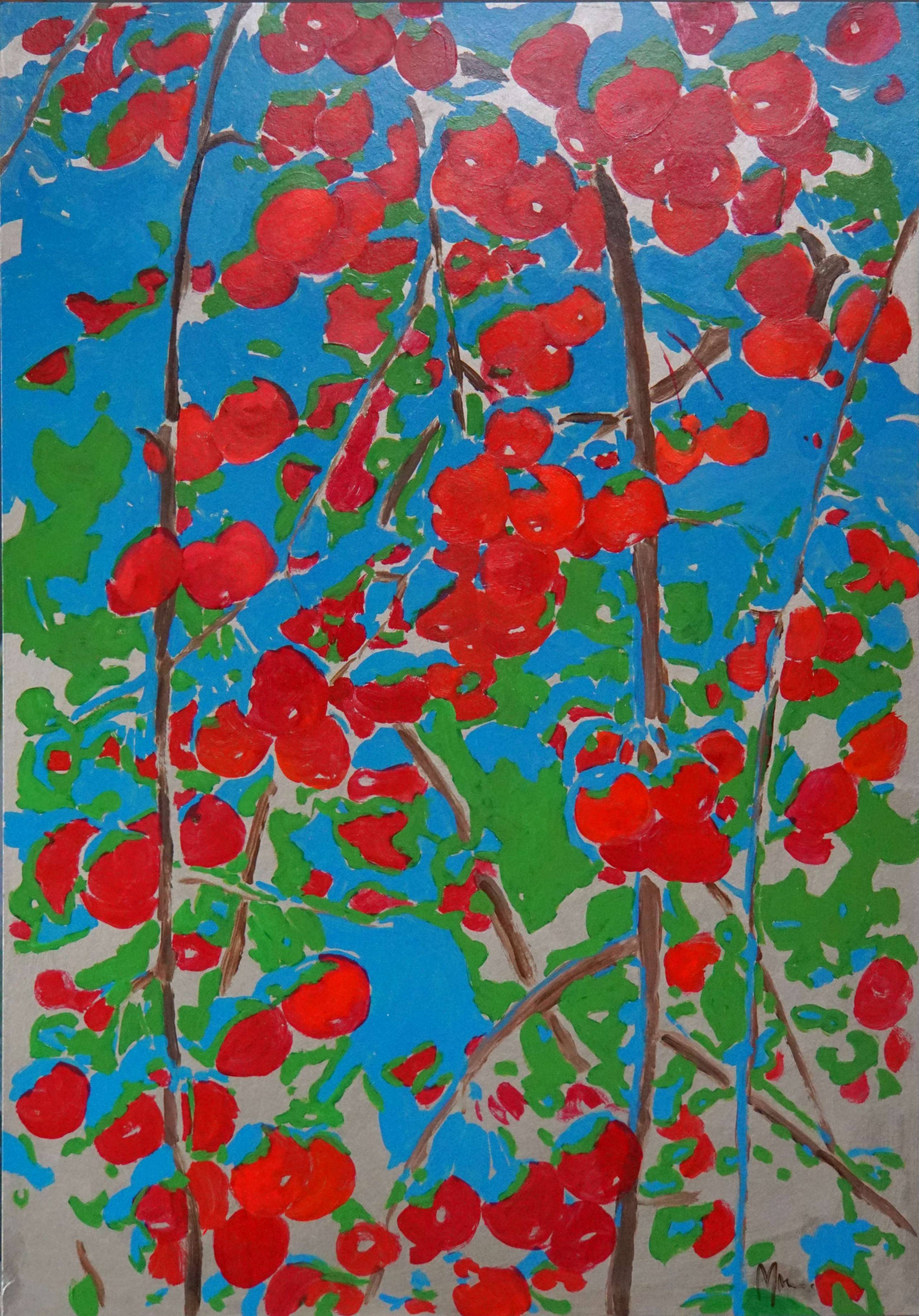 Obraz symboliczny, o żywych energetycznych kolorach (czerwonym, niebieskim, zielonym na satynowym tle) budzących pozytywne emocje, dekoracyjny. Karton dobrze zagruntowany farbą oraz werniksem z obydwu stron. Fragmenty tła o platynowym kolorze - satynowe, o lekkim połysku. Wskazana lekka, błyszcząca rama lub zgodnie z własną wizją.