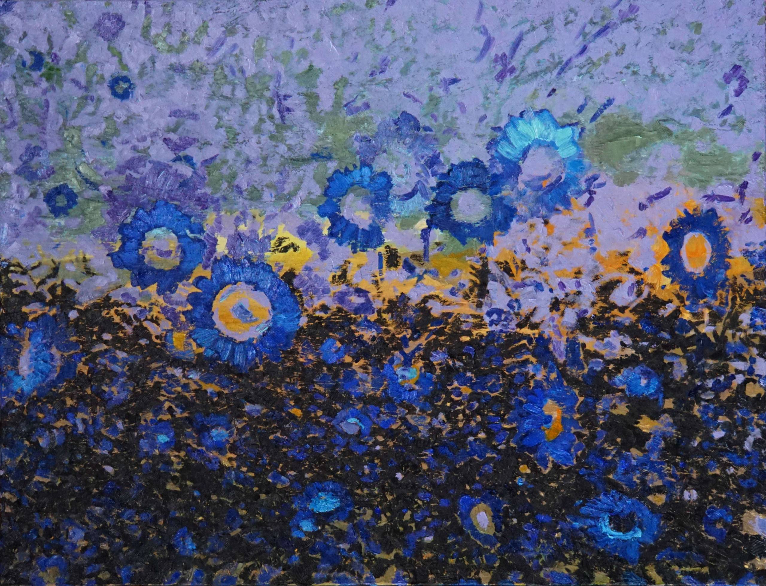 Obraz symboliczny, nostalgiczny, jednocześnie pozytywny, o "nocnych kolorach" (fiolet, granat, czerń z fragmentami żółtego i pomarańczowego), trochę bajkowy, dekoracyjny. Może być bez ramy lub zgodnie z własną wizją.