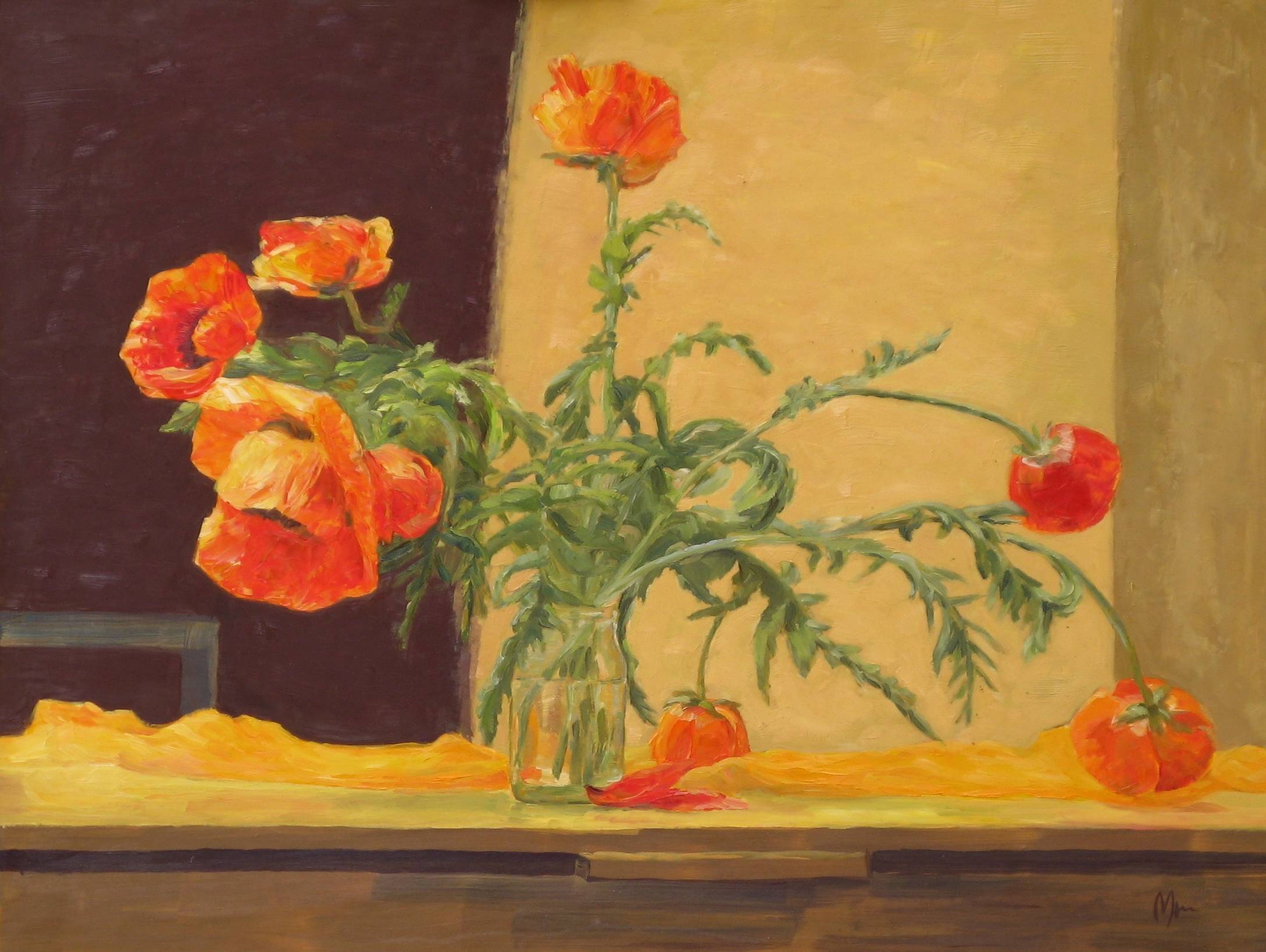 Na obrazie widzimy urokliwą martwą naturę z makami. Te czerwone kwiaty o pełnych i energicznych płatkach wybijają się na tle jednolitej, beżowej ściany. Ich intensywna czerwień wręcz krzyczy, przyciągając wzrok i dodając energii całej kompozycji. Akwarela? Może olej. Zdecydowana faktura sugeruje, że artysta sięgnął po grube pociągnięcia pędzlem, dodając dziełu tekstury. Te kwiaty jakby chciały powiedzieć hello, dzieląc się swoim urokiem z odbiorcą. Atmosfera obrazu jest ciepła, przypominająca letnie popołudnie. Subtelna gra światła i cienia tworzy wrażenie głębi i czyni obraz bardziej przestrzennym. Wygląda jak scena ze snu o idealnym dniu, gdzie nawet czas przystaje na kilka minut. Styl tego płótna kojarzy się z impresjonizmem, choć kolory są bardziej nasycone, a linie mocniej zarysowane. Urok tej pracy tkwi w jej prostocie i szczerości. Przypomina mi to letnie dni, kiedy beztrosko biegałem po łąkach – mówiłby to 7-letni Jaś. Patrząc na to dzieło, można poczuć radość, spokój, a nawet melancholię za tymi chwilami, które odeszły. A może to tylko ja tak czuję. Tak czy inaczej, to piękne przypomnienie, by zauważać małe rzeczy wokół nas.
