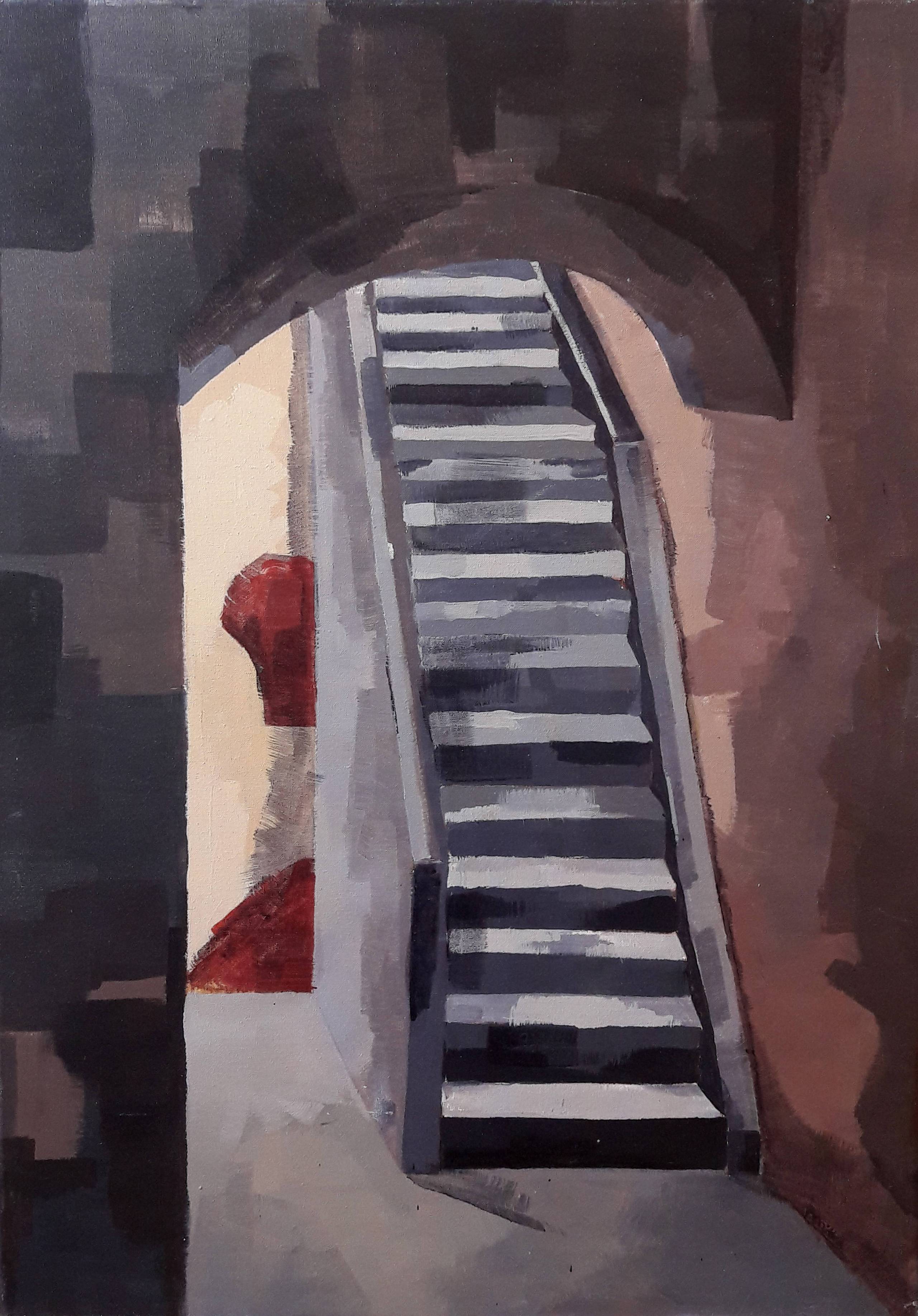 Obraz przedstawia tajemnicze schody, które nikną w głębokim łuku architektonicznym. Dominują tu odcienie szarości i brązów, z delikatnymi akcentami czerwieni po lewej stronie. Kompozycja jest dość surowa, ale przez to niesamowicie intrygująca. Kojarzy się z miejską przestrzenią z dawnych lat, może podziemia jakiejś starej kamienicy. Atmosfera jest nieco mroczna i enigmatyczna, przywodząca na myśl opowieści o duchach albo dawnych, zapomnianych miejscach. Styl jest zbliżony do abstrakcji geometrycznej. Artysta posługuje się szerokimi pociągnięciami pędzla, co dodaje dziełu wyrazistości. To trochę jakbym oglądał film noir, you know? Schody zdają się prowadzić donikąd, jakby zapraszały nas do odkrycia ich sekretów. Dla mnie to taka skrzynia pełna niewiadomych. Może kryją opowieść o zagubionych marzeniach lub nieodkrytych tajemnicach. "Te schody są długie!" mógłby powiedzieć mały chłopiec. I miałby rację. Dzieło z pewnością wzbudza emocje, głównie przez swoją prostotę. Każdy krok na tych schodach to jak powolne odkrywanie strony książki pełnej zagadek i sekretów. Obraz, choć stonowany kolorystycznie, jest potężny w swoim wyrazie i wzbudza refleksję nad ludzką podróżą w nieznane.