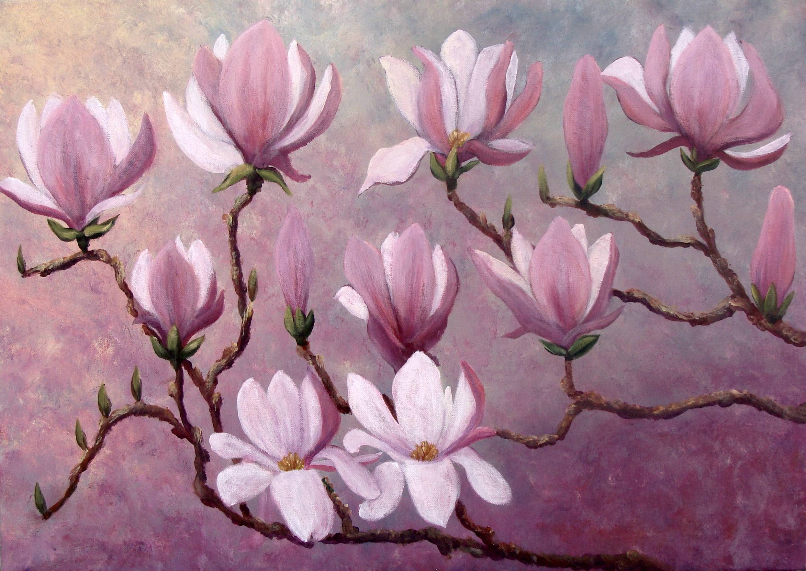 Na obrazie widzimy subtelną kompozycję gałązek magnolii, unoszących się na delikatnym tle pastelowych różów i fioletów. Kwiaty przedstawione są w różnych stadiach rozkwitu, od zamkniętych pąków po w pełni rozwinięte płatki. Kolry są stonowane lecz intensywne, tworząc wrażenie spokoju i harmonii. Artysta użył miękkich pociągnięć pędzla, co dodaje całości lekkości i eteryczności. Można prawie poczuć zapach tych pięknych kwiatów. Obraz emanuje spokojem i nostalgią, jakby zatrzymał moment ulotnego piękna natury. W stylu przypomina nieco impresjonistyczne techniki, gdyż skupia się na uchwyceniu wrażenia chwili. Rysunek jest pełen emocji i choć wygląda takie simple, wprowadza odbiorcę w stan zadumy. Patrząc na te barwne płatki, można poczuć ciepło w sercu. My feel so happy jakbym wchodziła do zaczarowanego ogrodu. Czuję, że obraz ten przemawia do mnie, przypominając o bóle spontanicznych chwil życia, które powinno się celebrować. Wydaje się, że gałązki tańczą na wietrze, a każdy płatek jest opowieścią. Jest w tej scenerii coś magicznego, co sprawia, że czas na chwilę zwalnia, a ja mogę w pełni zanurzyć się w pięknie chwili zatrzymanej na płótnie.