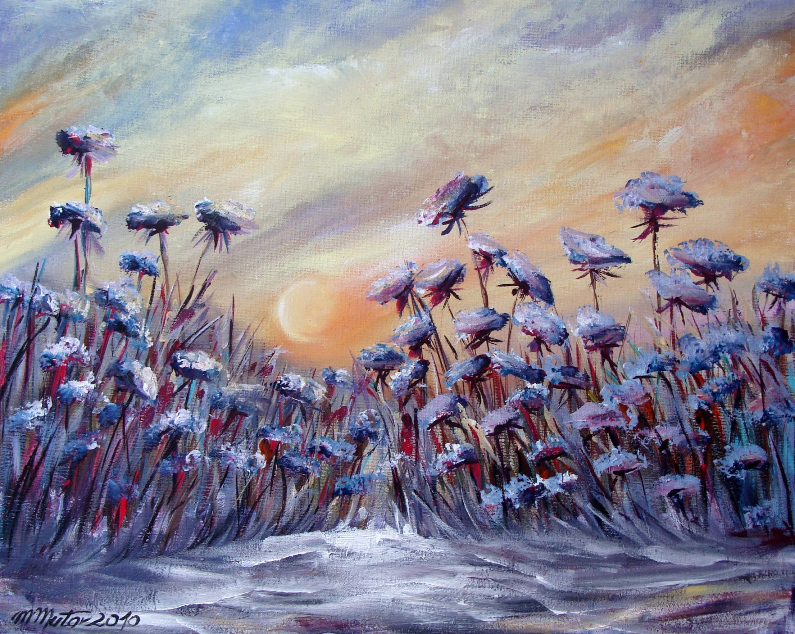Na obrazie widzimy pejzaż pełen uroczych kwiatów, które zdają się tańczyć na tle nieba. Dominują tu delikatne odcienie błękitu i fioletu, wzbogacone o ciepłe nuty pomarańczy i różu, tworząc harmonijną kompozycję. Kwiaty przypominają czapeczki, które czasem noszą dzieci zimą, kiedy bawią się na śniegu. Ich kształty są nieco rozmyte, jakby były widziane przez mgiełkę, co dodaje obrazowi tajemniczości. Atmosfera dzieła jest spokojna, lecz także tchnie melancholią - jak letni wieczór tuż przed zachodem słońca, kiedy wszystko cichnie. Artystyczny styl można określić jako impresjonistyczny, z wyraźnym naciskiem na światło i kolory. Widoczne pociągnięcia pędzla nadają dynamiczności i żywości. Obraz ten może wywoływać różne emocje: jedni poczują nostalgię, inni odnajdą w nim chwilę zadumy nad przeminającą chwilą. Patrząc na to dzieło, myślę o cichych spacerach po łące, gdy nadchodzi dusk, a światło robi się magiczne. Czy może być coś bardziej "relaxing"? Dla mnie to jest jak wejście do innego świata. Podoba mi się, jak w jednym momencie obrazy mogą wprowadzić nas w różne stany emocjonalne. Ogólnie, to taki obraz, który chciałoby się mieć w salonie, żeby codziennie przypominał o pięknie i spokoju natury.