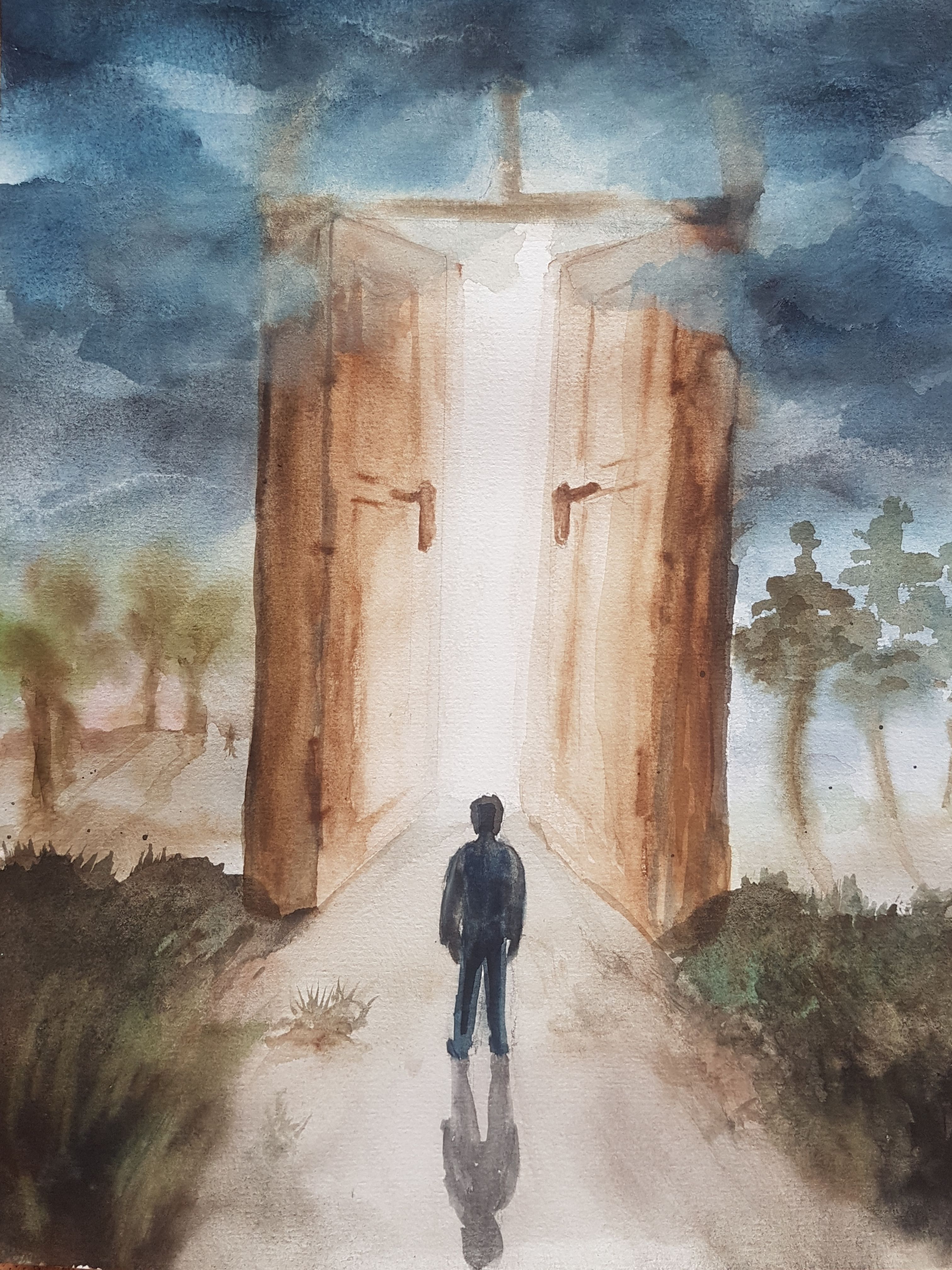 Obraz, który widzimy, pełen jest tajemniczości i symboliki. Dominują na nim przeważnie ciemne kolory przechodzące w jaśniejsze światło. W centrum stoi postać, która zdaje się być niewielka i niepozorna na tle ogromnych drzwi. Te drzwi, o ciepłym brązowym odcieniu, są otwarte, wpuszczając jasne światło, które kontrastuje z ciemnym, nastrojowym niebem. Kompozycja obrazu jest bardzo wciągająca, przyciągając wzrok widza do środka, ku światłu. Wygląda to trochę jak brama do innego świata or maybe just a new beginning. Atmosfera obrazu jest mieszanką niepokoju i nadziei. Jakiś dziwny spokój unosi się wokół, ale i czuć pewną grozę. Styl, w którym został wykonany, zdradza użycie akwareli. Delikatne rozmycia tworzą miękkie przejścia między kolorami, nadając całości subtelny i nieco rozmarzony wygląd. Może i przypomina mi to trochę senne marzenia, w których wszystko jest możliwe. Obraz wywołuje we mnie mieszane reakcje. Z jednej strony odczuwam strach, bo te ogromne drzwi – kto wie, dokąd prowadzą? Z drugiej strony, jest w tym coś kuszącego, pięknego. Taka tajemnicza brama to płótno możliwości, które każdy może wypełnić własnymi marzeniami i lękami. Mógłbym pomyśleć, że dziecko powiedziałoby: "To jak wrota do jakiejś bajki!". Bo naprawdę, tak właśnie to wygląda. Przeplatanie się światła i cienia sprawia, że całość staje się wręcz magiczna.