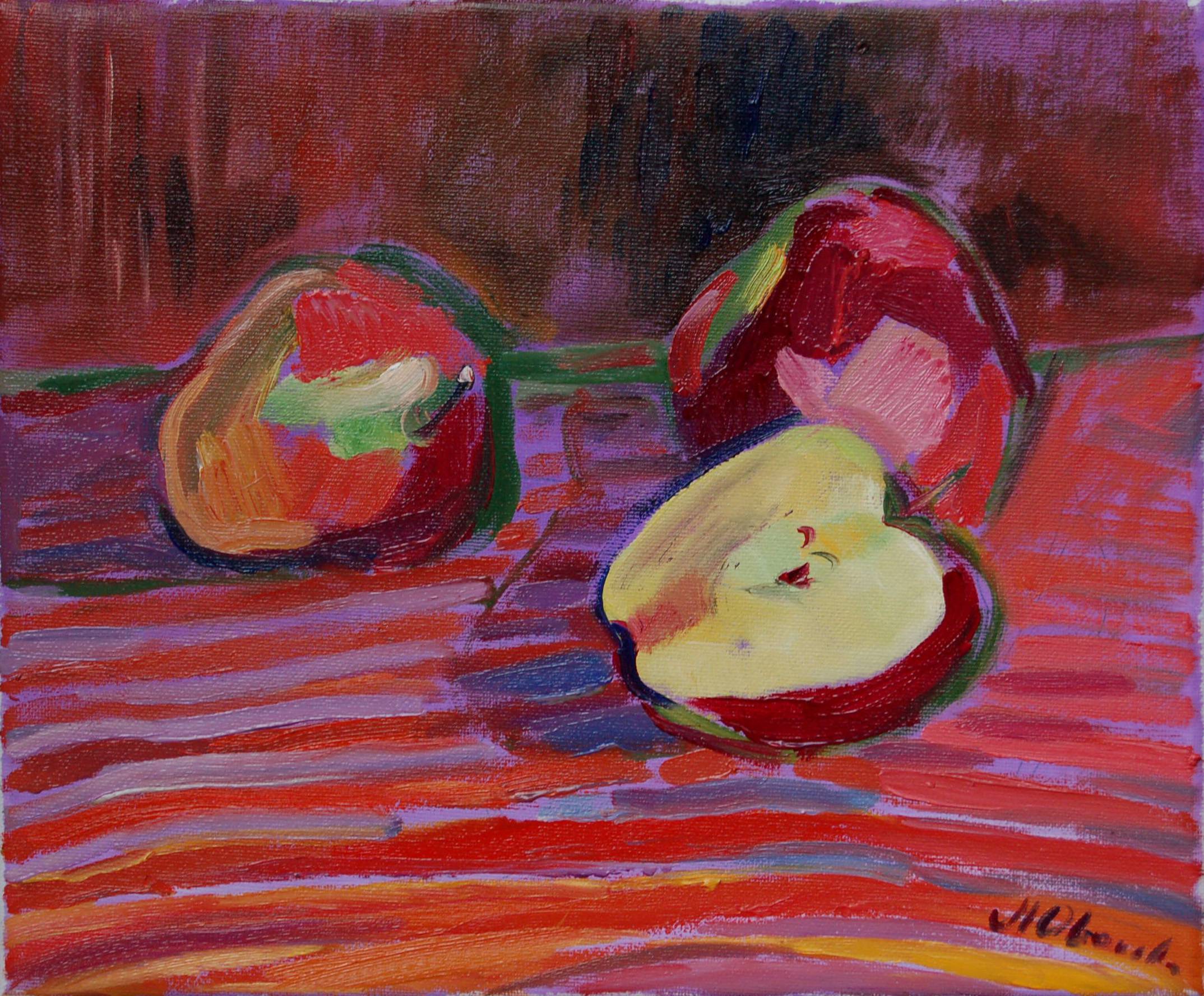 Tak smakowite jabłka trzeba namalować bardzo szybko, bo ślinka leci ;) A przede wszystkim zwiędnie jabłuszko przekrojone, a inne dojrzeją i znikną cenne zielonkawe plamy...