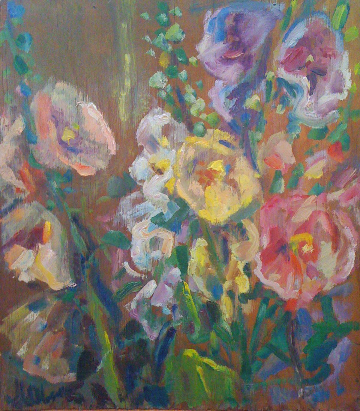 Obraz wykonany jest na cienkiej sklejce, pod kwiatami namalowałam leciutko metalicznie połyskujące tło w odcieniu ciemnego złota. Pod sąsiednim blokiem na osiedlu ktoś wysiał wszystkie możliwe kolory malw, była to feeria pięknych odcieni, cieszyły mieszkańców dwa sezony, po czym zaprowadzono trawnik szwedzki z żywopłotem ... :(
