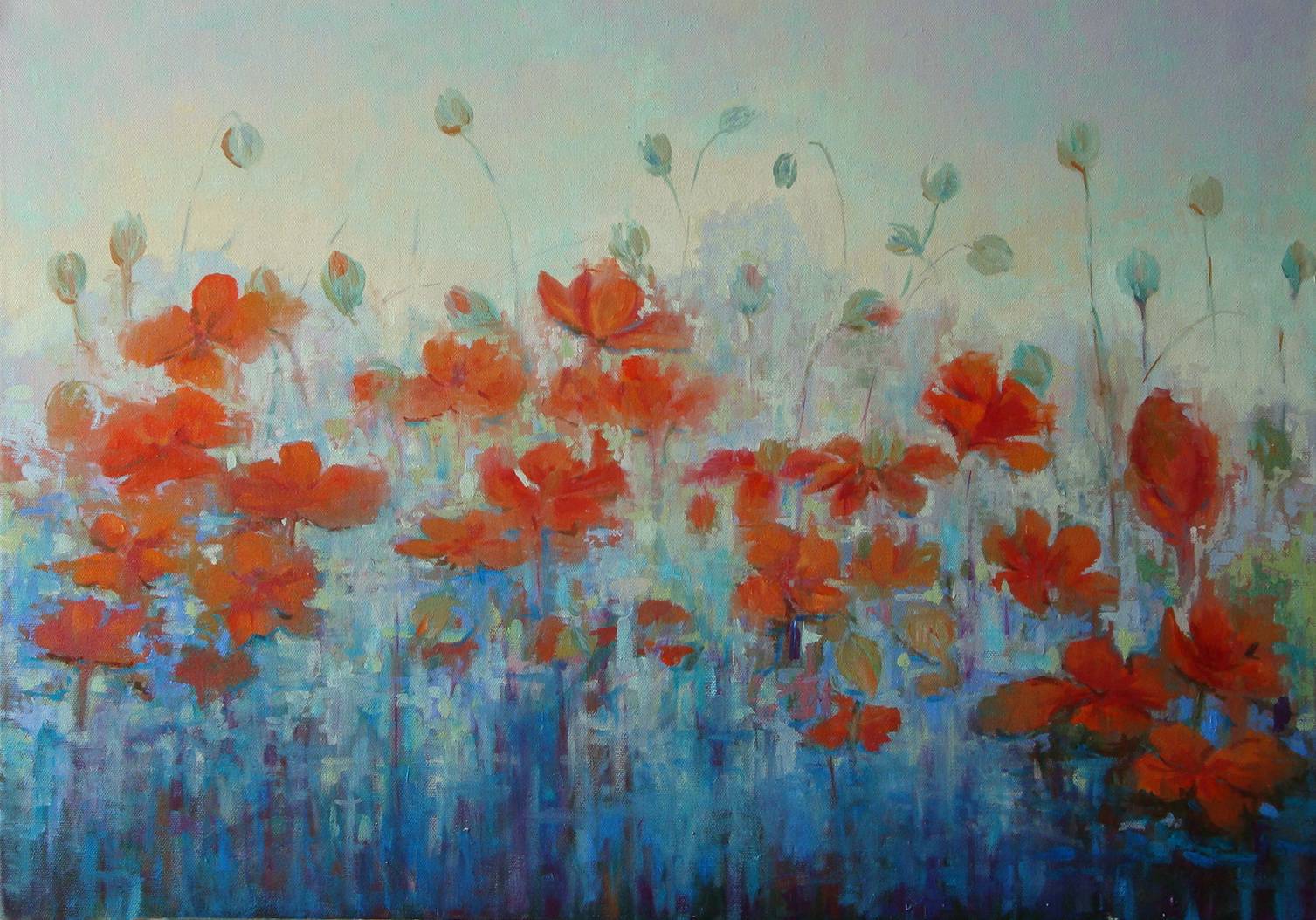 Na obrazie widzimy pole pełne maków, które zdają się tańczyć na wietrze. Ich intensywna czerwień kontrastuje z łagodnym, błękitnym tłem, tworząc przyjemną dla oka grę kolorów. Kwiaty są rozmyte, niedokładnie zarysowane, jakby zanurzone we mgle, co dodaje całej scenie delikatności i lekkości. Można wręcz poczuć powiew letniego wiatru. Obraz emanuje spokojem i beztroską. Wydaje się, że czas staje w miejscu, a świat zewnętrzny nie ma znaczenia. Jest w nim coś magicznego, co przyciąga wzrok. Artysta posłużył się techniką impasto, kładąc grube pociągnięcia pędzla, które nadają teksturę i głębię. Patrząc na to dzieło, można poczuć tęsknotę za letnimi dniami spędzonymi na łonie natury. Dzieci przypomniałyby sobie, jak świetnie jest biegać po łące. "Ale super!" pomyślałoby takie dziecko. Obraz budzi radość i zachwyt, ale też nutę nostalgii. Artysta uchwycił moment zatrzymanej w czasie natury, moment, który jest jednocześnie efemeryczny i wieczny. A może to właśnie jest kwintesencja piękna? Tkanina życia spleciona z barw, faktur i emocji, z angielskim twistem.