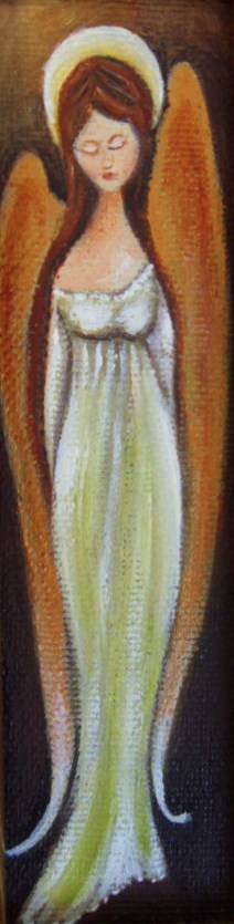 Obraz przedstawia anioła w delikatnych odcieniach brązu i bieli. Postać jest smukła, a jej włosy mają ciepły, kasztanowy kolor. Skrzydła szeroko rozpostarte, zdają się obejmować przestrzeń wokół. Kompozycja jest symetryczna, co dodaje harmonii. Tło jest ciemne, co podkreśla blask anielskiej sylwetki. Atmosfera jest spokojna, wręcz kontemplacyjna. Styl dzieła przypomina technikę pasteli, z subtelnymi przejściami kolorów. Patrząc na ten obraz, czuję spokój. Może trochę wyciszenia. Jest coś magicznego w tym aniele. Wygląda jakby zaraz miał coś powiedzieć. Albo zaśpiewać. Jego twarz wyraża zadumę. Jasne kolory sukni kontrastują z ciemnym tłem, jakby ten anioł był prawdziwym źródłem światła. To takie "serene". Patrzę na niego i myślę, jak dzieciak: ale fajne skrzydła! Może to symbol nadziei. Może ochrony. Albo po prostu piękna samo w sobie. Każdy może widzieć tu coś innego. To jest super w sztuce.