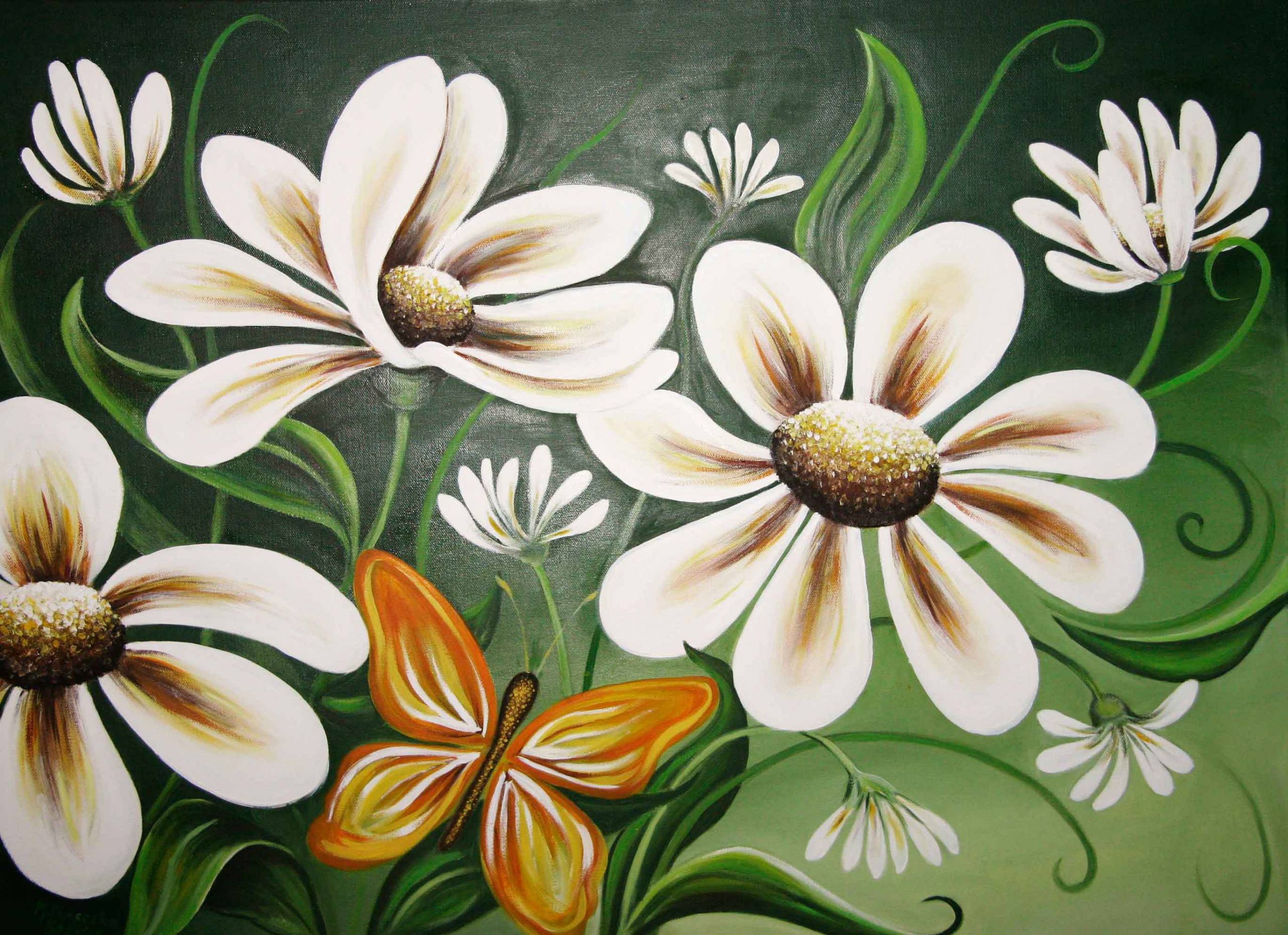 Ten obraz to eksplozja natury w pełnej krasie. Na pierwszym planie ukazują się bajecznie duże białe kwiaty z brązowymi akcentami, które wydają się niemal skrywać w zielonym gąszczu liści. Każdy płatek jest starannie wymalowany, a ich delikatne gradienty koloru tworzą magiczną aurę spokoju i harmonii. A po środku, takie malutkie cudo, pomarańczowy motyl, jak z bajki. Tło – ciemne, ale nie ponure! Jego głęboka zieleń podkreśla piękno kwiatów. Pod względem techniki artystycznej obraz wydaje się być malowany w stylu realistycznym z delikatnym twistem impresjonistycznym. Płaszczyzny barw są płynne, a światło zdaje się subtelnie muskać każdy element kompozycji. To dodaje pracy dynamicznego, ale jednocześnie uspokajającego akcentu. Całość wywołuje poczucie lekkości i swobody – jak letnią porą, gdy wszystko dookoła tętni życiem. Patrząc na to dzieło, można się zasłuchać w ciszy chwili, a potem pomyśleć: wow, to jest jak magiczna poduszka w ogrodzie. To perfect balans między rzeczywistością a wyobraźnią!