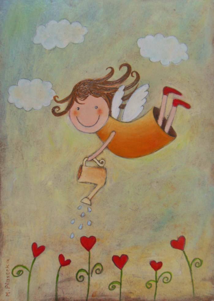 Na obrazie widzimy urocze przedstawienie małego anioła unoszącego się w powietrzu. Jego złociste włosy wirują, a delikatne skrzydła wydają się niemal eteryczne. Tło w pastelowych odcieniach zieleni i błękitu nadaje kompozycji lekkości. Anioł trzyma w ręku konewkę, z której płyną niebieskie kropelki wody, tworząc kontrast z czerwonymi serduszkowymi kwiatami poniżej. Całość jest pełna ciepła i radości. Czujesz, jakbyś mógł dotknąć nieba. Obraz promieniuje niewinnością i spokojem. Delikatne kolory i miękkie linie przywołują atmosferę dziecięcej fantazji. Styl artysty jest prosty, ale zarazem wyrazisty, przywołując na myśl ilustracje z książek dla dzieci. Można by powiedzieć, że obraz dosłownie "is full of whimsy". Odbiorca może poczuć falę spokoju i optymizmu. Może też przywołać wspomnienia z dzieciństwa, kiedy wszystko wydawało się takie proste i magiczne. "Patrz, ten aniołek leci!" - tak by powiedziało 7-letnie dziecko. Artystycznie obraz balansuje między prostotą a głębią wyrazu. Mimo swojej nieskomplikowanej formy, wywołuje uśmiech i zachęca do zatrzymania się na moment. Personalna refleksja? To jak powrót do krainy dzieciństwa, gdzie wszystko jest możliwe, a dobro i piękno kryją się w najprostszych chwilach.