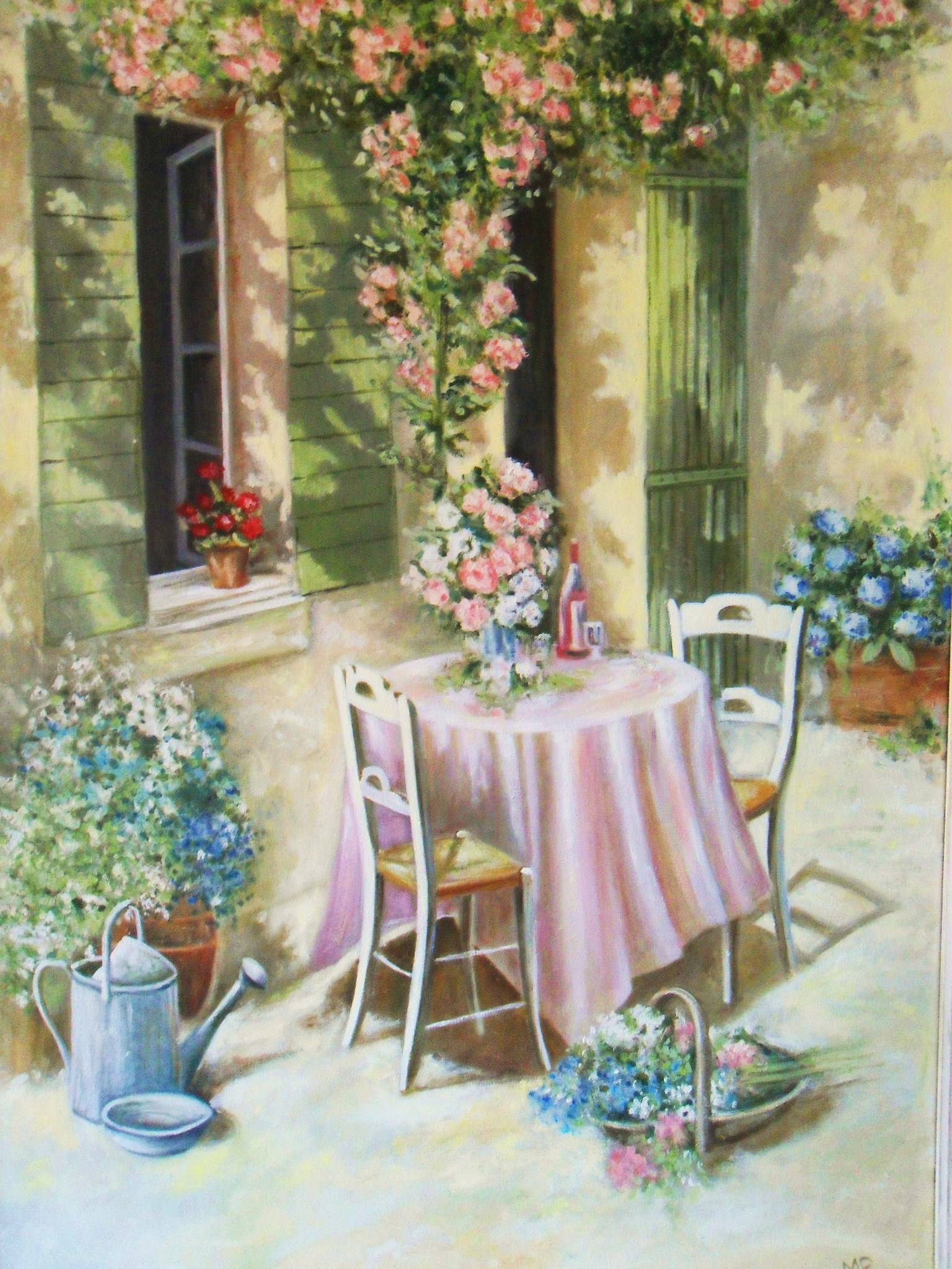 Na obrazie widzimy uroczy zakątek w zaciszu ogrodu. Stół przykryty subtelnym, różowym obrusem stoi dumnie w centrum, otoczony dwoma prostymi krzesłami. Nad stołem unosi się winorośl z kwitnącymi różowymi kwiatami, delikatnie opadającymi na okno z drewnianymi okiennicami. Światło słoneczne tworzy ciepłe plamy na tynku budynku i rzuca miękkie cienie, budując atmosferę spokoju i beztroski. Całość jest skomponowana tak, że niemal czuć zapach kwiatów i świeże powietrze. Artysta użył realistycznych technik malarskich, oddając detale z niezwykłą precyzją. Obraz emanuje spokojem, wprowadzając nastrój letniego popołudnia, kiedy czas zwalnia. Ten idylliczny zakątek może przyprawić o nostalgię za chwilami spędzonymi na łonie natury. Patrząc na to dzieło, można poczuć się, jakby siedziało się tam z książką i filiżanką herbaty. Wow, ale bym tu chciał mieszkać! Kolorystyka obrazu, z dominującymi pastelami i świeżymi zieleniami, zachęca do odpoczynku i zanurzenia się w chwili. Jest to magiczne miejsce, w którym można zapomnieć o świecie i "just breathe". W każdym z nas może obudzić marzenia o małym domku na wsi, gdzie wszystko jest proste i piękne.