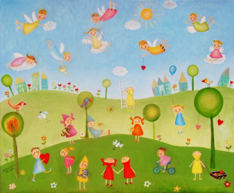 Ten obraz to prawdziwa eksplozja kolorów i radości. Na pierwszym planie zielone pagórki, na nich dzieci w jasnych, wesołych ubraniach. To chyba jakaś magiczna kraina, gdzie wszyscy są szczęśliwi. Na niebieskim niebie unoszą się skrzydlate aniołki, a słońce wesoło uśmiecha się zza chmur. Kwiaty jakby tańczą na wietrze, a drzewa przypominają cukierki z bajki. Kompozycja jest dynamiczna, pełna życia i ruchu, wszędzie coś się dzieje. Atmosfera tego dzieła jest po prostu rozkoszna. Przypomina mi beztroskie dni dzieciństwa, jakbym mógł znowu bawić się na podwórku bez krzty zmartwień. Wszystko wydaje się takie easy, jakby życie było jednym wielkim placem zabaw. Artystycznie obraz jest pełen idealizacji i prostoty, jakby stworzony dziecinną ręką. Użycie jasnych, pastelowych kolorów nadaje mu lekkość. Artysta zastosował technikę płaskiego malowania, brak tu cieniowania czy skomplikowanych detali, co dodaje uroku. Można poczuć ciepło i miłość bijącą z obrazu. Serduszka na drzewach, uśmiechy na twarzach. Obraz wywołuje uśmiech nawet po ciężkim dniu. Czuję, jakby ktoś chciał powiedzieć „hej, życie jest piękne!”. Czasem zapominamy o prostocie życia, a to przecież ona daje prawdziwą radość. Jedna z postaci trzyma balon i jakoś czuję, że lada moment pofrunie. Jakaś cząstka mnie chciałaby tam być.