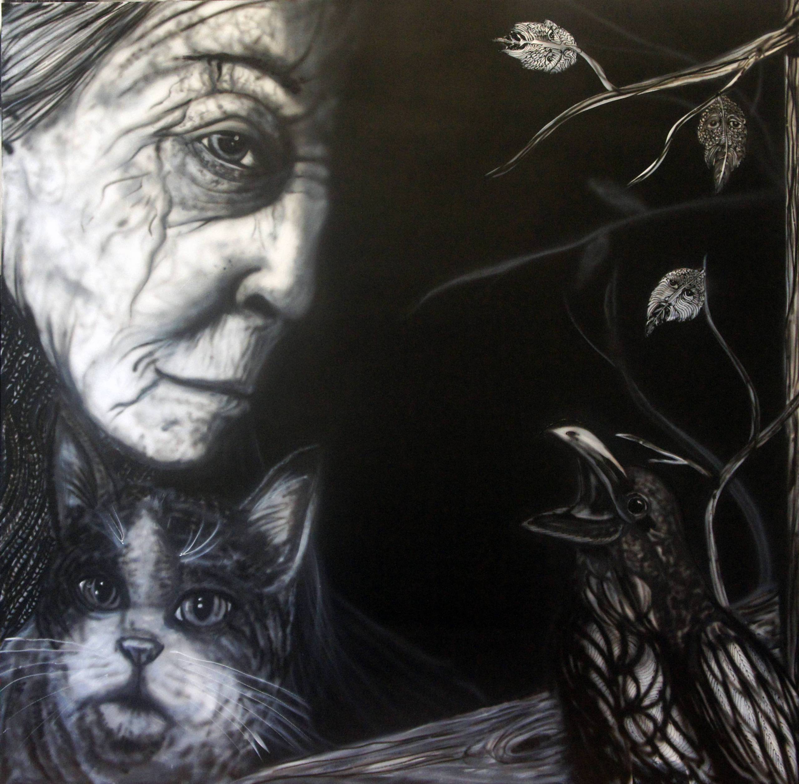Obraz z cyklu "Czarownice". Czas, lata doświadczeń, porażek i sukcesów, potęga natury, tajemnice świata widzialnego i niewidzialnego- wszystko to kryje się w ich oczach i na pomarszczonych obliczach moich czarownic. Stara kobieta nie jest tu bezsilna, bez nadziei,nie jest samotna.Ona jest władczynią lasu, zwierząt, łącznikiem ze światem zmarłych, jest niepokonana. Cykl prac, który stworzyłam pokazuje jedność czarownic z naturą. Wiedźmy do pewnego stopnia władają leśnym światem, ale z drugiej strony natura sama je pochłania, liście wszystko widzą, zwierzęta są ich doradcami. Czarownice nie chcą straszyć i budzić lęku, są tajemnicze, zamyślone, żyją we własnym świecie. Nie szukają twojego wzroku, nie patrzą się na Ciebie, ale same pozwalają się obserwować. Popatrz więc i wejdź do ich świata, chociaż na chwilę....