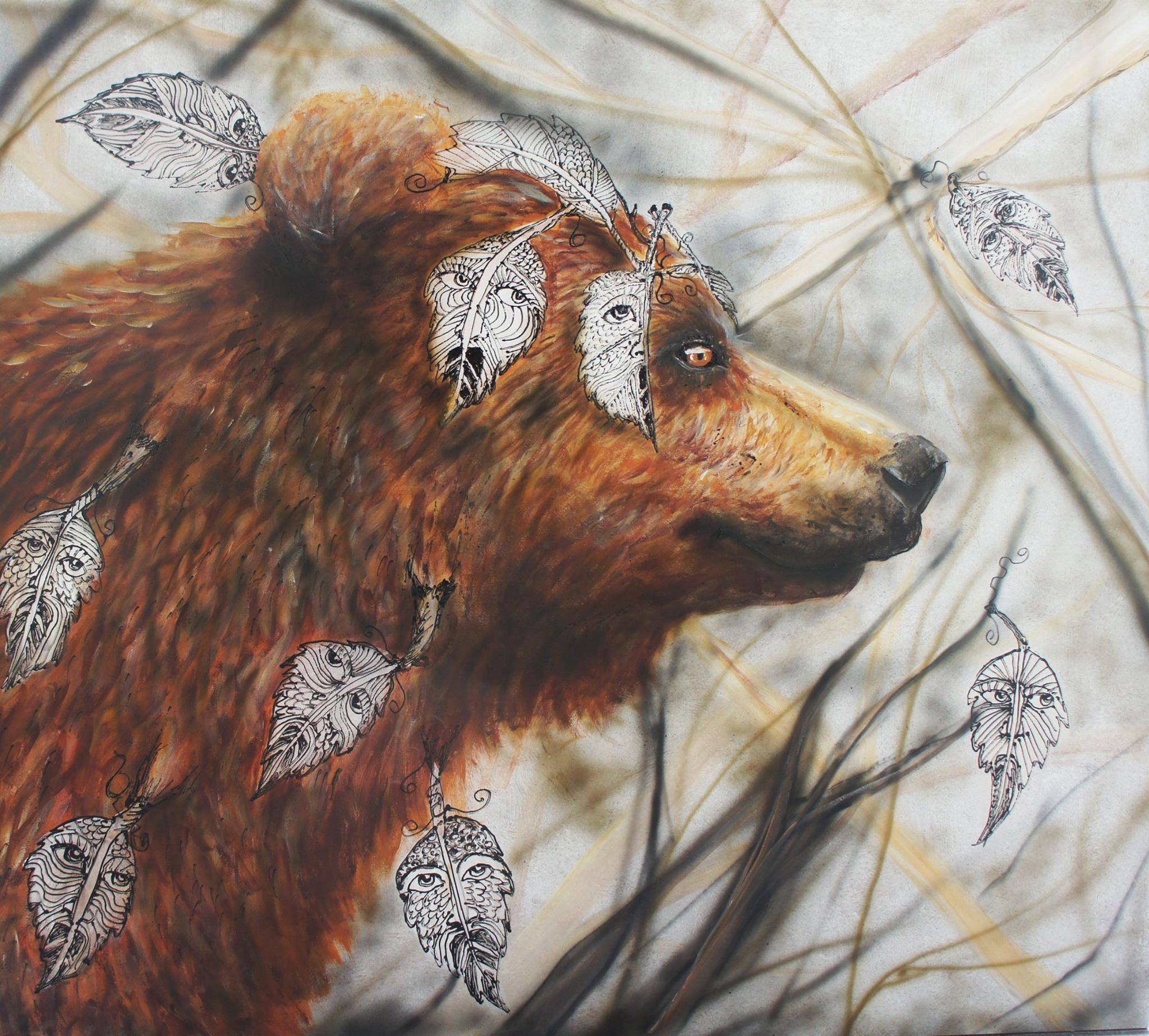 Obraz przedstawia majestatycznego niedźwiedzia z uderzającą sierścią w odcieniach ciepłego brązu, który kontrastuje z delikatnymi, czarno-białymi liśćmi unoszącymi się wokół jego głowy. Te liście nie są takie zwykłe – w środku nich pojawiają się skomplikowane, zaskakująco detaliczne twarze, które patrzą na widza z lekką nutą tajemnicy. Kompozycja obrazu jest dynamiczna, ze skośnymi liniami sugerującymi ruch i wiatr. Atmosfera emanuje mieszanką nostalgii i refleksji, jakby ten niedźwiedź poddawał się myślom wędrującym w podmuchach jesieni. Jest w tym czymś magiczny element "fantasy", gdzie rzeczywistość spotyka się z snami. Styl obrazu jest delikatny, ale zarazem ekspresyjny. Artysta zastosował subtelne przejścia tonów i detali, co nadaje dziełu prawdziwą głębię. To trochę, jak oglądanie obrazów przez mgłę. Można by pomyśleć: "Wow, to trochę jak dream world". Odbiorca może poczuć narastające poczucie spokoju, a nawet pewną melancholię. Może to też być nieco niepokojące, dzięki tym czujnym twarzom. A 7-letnim okiem: niedźwiedź wygląda trochę jak wielki miś w dziwnym lesie, gdzie liście mają oczy, które widzą wszystko. Ta mieszanka surrealizmu i naturalizmu wciąga nas do własnej baśniowej opowieści, gdzie każdy element zdaje się szeptać tajemnice lasu. Tekstura i detale sugerują, że artysta miał niesamowitą pasję do uchwycenia szczegółów. Truly mesmerizing.