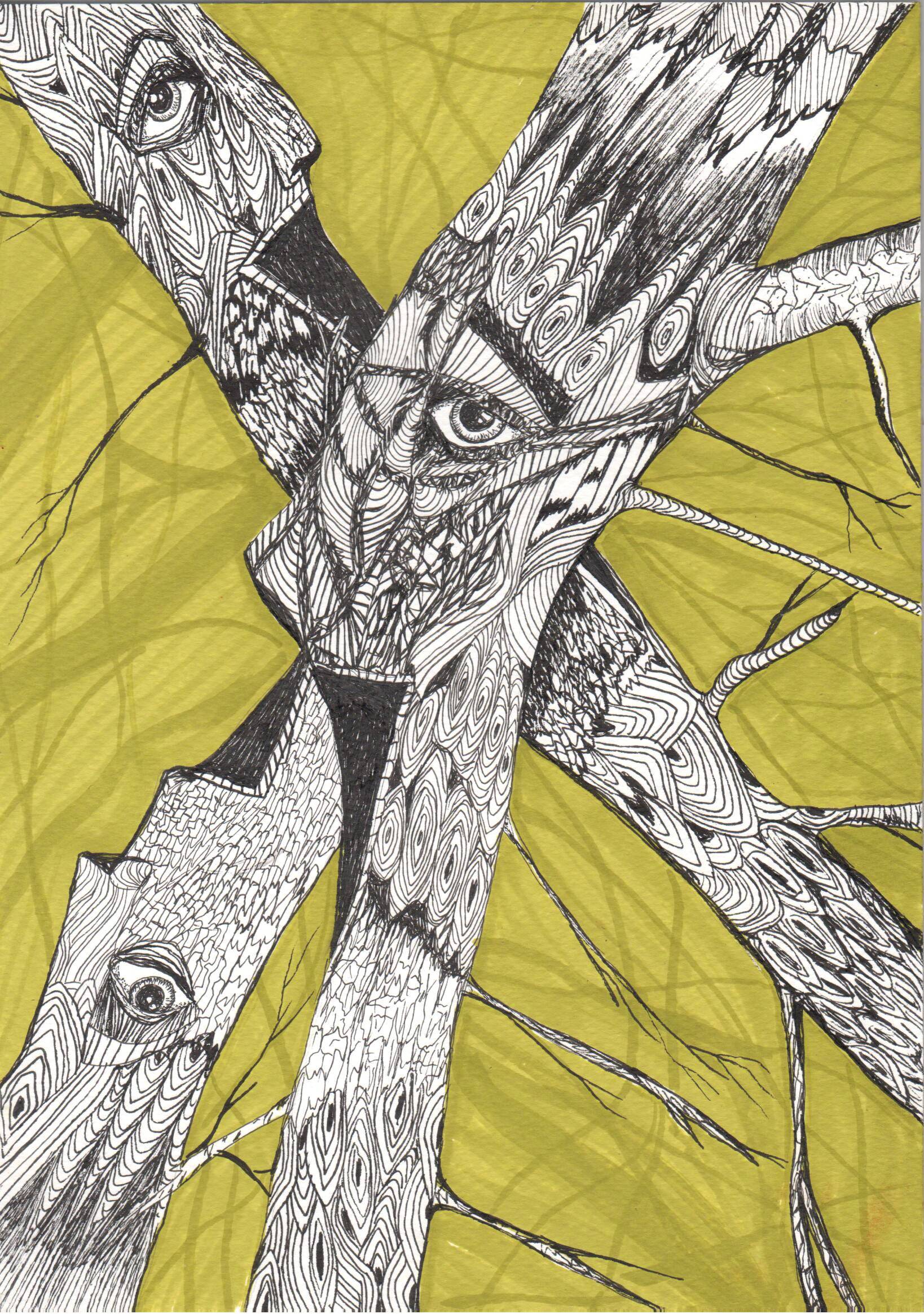 Obraz emanuje złożonością i tajemniczością, łącząc surrealistyczne formy z naturą. Głęboka zieleń tła tworzy spokój, kontrastując z czarno-białymi, niepokojącymi liniami drzew. Gałęzie, przypominające organiczne formy, są ozdobione wzorami, które przyciągają wzrok niczym zaklęte symbole. A tak w ogóle, oczy w drzewach patrzą na Ciebie w sposób, który daje gęsią skórkę. Styl artysty zdaje się łączyć techniki rysunku linearnowego z większym naciskiem na szczegół, dzięki czemu obraz zyskuje trójwymiarowy, niemal hipnotyzujący efekt. Gdy patrzę na ten obraz, czuję mieszankę fascynacji i niepokoju. To jakby drzewa miały swoje sekrety, swoją "soul", którą chcą ci szeptać. Czy te oczy widzą nas i nasz świat inaczej? Dla dziecka wmówiłbym się, że drzewo ma buzie! To cudownie prowokujące i nieco dziwaczne. Ten artwork na pewno zmusza do refleksji, czy to my obserwujemy naturę, czy natura nas. W swojej warstwie emocjonalnej pozostawia nas z pytaniem o naszą relację z otoczeniem, wciąga nas w swój świat, jednocześnie pozostawiając niedosyt zrozumienia.