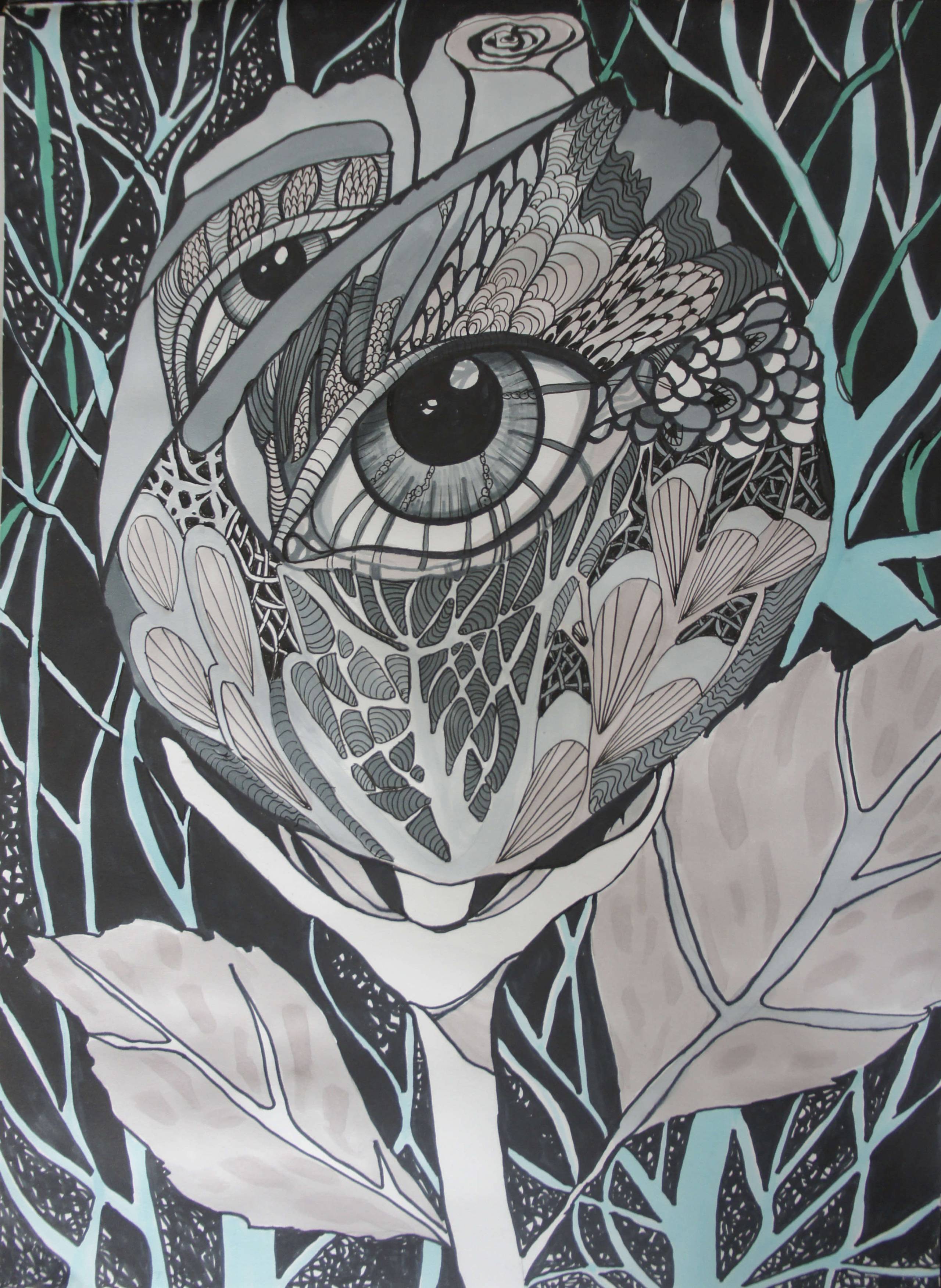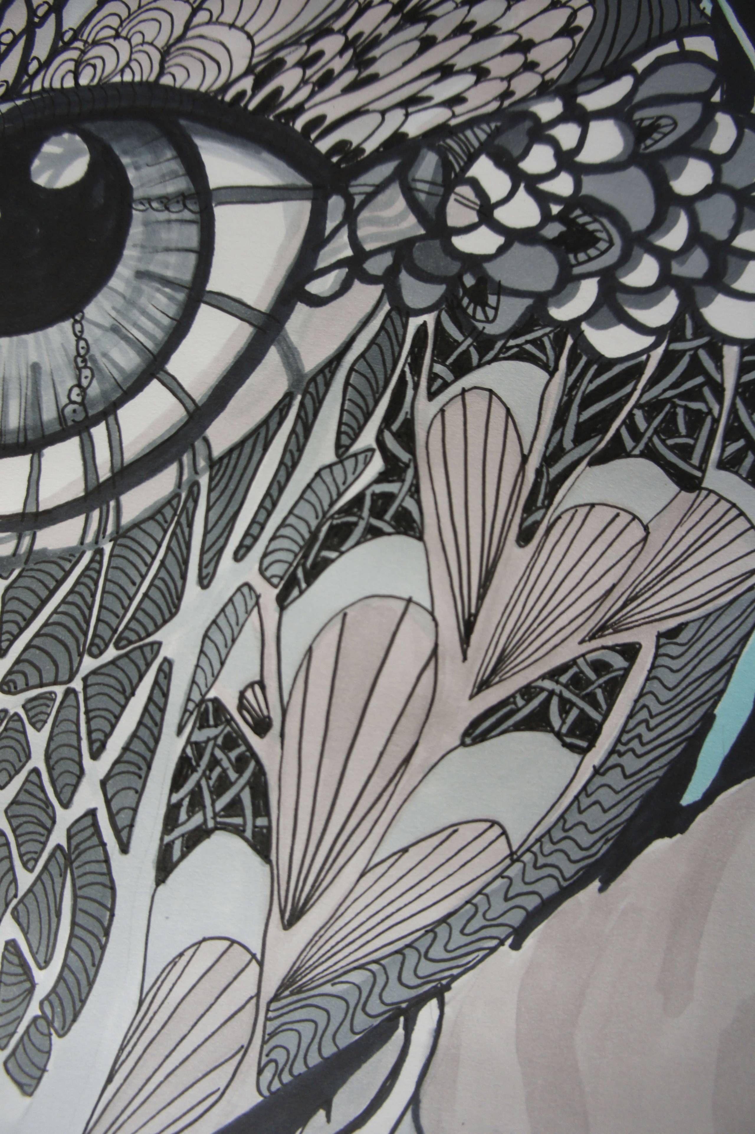 Obraz hipnotyzuje od pierwszego wejrzenia. Przedstawia ogromne oko, które wydaje się patrzeć prosto w duszę obserwatora. Kolory czerni, szarości i subtelnych odcieni bieli tworzą intensywną, wręcz nieziemską atmosferę. Oko otoczone jest misternymi wzorami przypominającymi liście i pióra, co dodaje kompozycji organicznego charakteru. Na pierwszy rzut oka można pomyśleć, że to magiczne drzewo z enchanted forest. Artystyczny styl obrazu to mieszanka surrealizmu z elementami abstrakcji. Artysta z wielką precyzją posługuje się cienką linią i detalem, co sprawia, że każdy element wydaje się przemyślany i starannie wykonany. Pewna jest tu też dynamika, której nie sposób zignorować. Nastrój jest nieco tajemniczy, może trochę niepokojący, ale jednocześnie przypominający o harmonii natury. Obraz prowokuje do refleksji nad naszą więzią z przyrodą. Siedmioletnie dziecko mogłoby powiedzieć - "to oko to taka magiczna roślina z bajki". Ile w tym prawdy? Wiele. Bo obraz zachwyca i intryguje, czasem przyprawia o dreszcze, a czasem po prostu fascynuje. Dziwię się za każdym razem, jak można tak pięknie połączyć naturę z wyobraźnią.