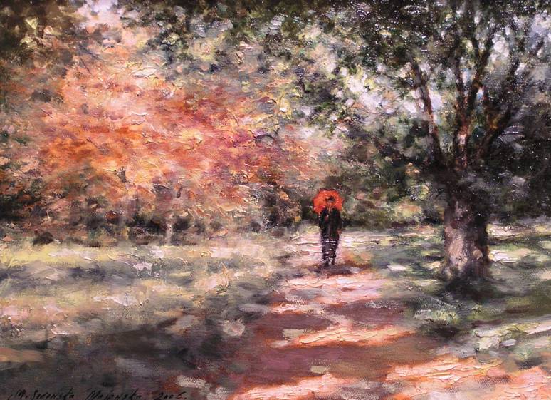 Obraz przedstawia jesienny krajobraz zanurzony w ciepłych barwach. Na pierwszym planie widzimy postać z pomarańczowym parasolem, który przyciąga wzrok jak magnes. Tło wypełnione jest złotymi i pomarańczowymi liśćmi, które wirują na lekkim wietrze. Drzewa po prawej stronie tworzą naturalny dach, przepuszczający tylko strużki światła. Kompozycja ma w sobie coś magicznego. Niemal słychać szelest liści pod stopami. Obraz emanuje melancholijną, choć nieco tajemniczą atmosferą. Taka scena może wywołać w nas nostalgia za spacerami w parku późnym popołudniem. Artysta używa delikatnych, rozmytych pociągnięć pędzla typowych dla impresjonizmu, dając wrażenie ulotności chwili. Jakby czas zwolnił choć na chwilę. Może to świadczyć o chęci uchwycenia chwili, zanim przeminie. Dzieło może wzbudzać w odbiorcach różne emocje, od spokoju po refleksję nad przemijaniem. Mały czerwony parasol dodaje dynamiki do całej sceny, niemal jak echo dziecięcej beztroski. To trochę jak „magic”. Przywołuje wspomnienia i budzi tęsknoty za dzieciństwem, kiedy wszystko wydawało się większe i bardziej kolorowe. Magiczny spacer przez czas i przestrzeń, który pozostawia nas z uśmiechem i lekką zadumą.