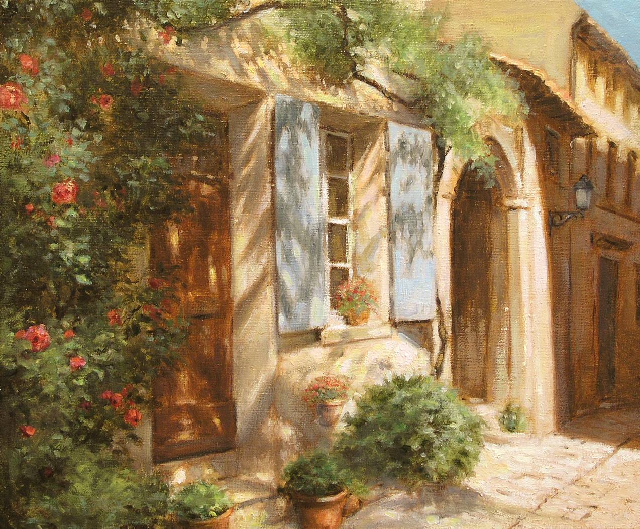 Na obrazie dominuje ciepła paleta kolorów: złociste żółcie, brązy i delikatne zielenie, które tworzą sielankowy nastrój. Promienie słońca delikatnie oświetlają kamienną fasadę domu z drewnianymi okiennicami, nadając całości wyjątkowej harmonii. Rośliny pnące się po ścianach i czerwone kwiaty wnoszą do kompozycji element życia i energii. Styl obrazu przypomina impresjonistyczne dzieła, z miękkimi pociągnięciami pędzla, które kreują efekt "soft". Dzięki temu czujemy lekki podmuch wiatru i ciepło letniego popołudnia. To miejsce, gdzie czas wydaje się zwalniać, a serce zaczyna bić wolniej. Obraz budzi we mnie tęsknotę za spokojem i prostotą dawnych dni, takimi bez pośpiechu. Wiem, że te krzewy pachną latem. Patrząc na tę scenę, wyobrażam sobie dźwięki cykad i zapach rozmarynu unoszący się w powietrzu. Ach, jakby to było wspaniałe usiąść na schodach i czytać książkę. A potem, tak po prostu, wpaść na chwilę w zadumę. Myślę sobie: "summer vibes". Całość emanuje ciepłem i nostalgią. 7-letnie dziecko mogłoby powiedzieć: “Chciałbym tam mieszkać i bawić się cały dzień”. Obraz zaprasza do marzeń i odpoczynku.