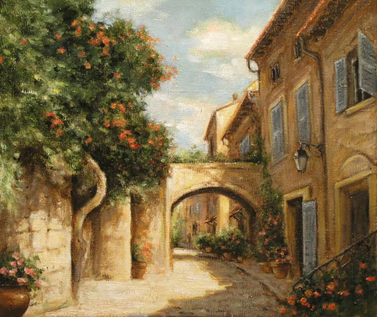 Ten obraz przedstawia sielankową uliczkę z idyllicznego miasteczka, gdzie jasne, słoneczne kolory przyciągają wzrok od razu. Żółte fasady budynków doskonale komponują się z błękitnym niebem, a zieleń drzew i krzewów wyłaniająca się zza kamiennych murów dodaje całości świeżości. Artyści często wybierają takie sceny, by przenieść nas do miejsc pełnych spokoju i prostoty. Atmosfera jest wręcz magiczna i przytulna, jak z jakiegoś dawno zapomnianego snu. Można niemalże poczuć ciepło promieni słonecznych na skórze. Styl obrazu to klasyczna impresja, z delikatnymi pociągnięciami pędzla, które tworzą wrażenie ruchu i życia. Bije z tego pewna nostalgia, która przyciąga wspomnienia z dzieciństwa, niby slow walk w letnie popołudnie. Emocje, jakie obraz wywołuje, to przede wszystkim spokój i radość. Czujesz się, jakbyś mógł w każdej chwili wrócić do tej uliczki, usiąść na ławeczce i obserwować otoczenie. Tak! Ja bym chciał tam pobiec i bawić się cały dzień! Widać, że artysta zastosował technikę z naciskiem na światło, które bawi się na kamiennych ścianach, tworząc niesamowite kontrasty. Obraz może wywołać u odbiorcy pragnienie ucieczki od codzienności, by cieszyć się chwilą. To miejsce, gdzie moglibyśmy przysiąść na chwilkę, zasłuchani w ciszy i szumie liści na wietrze.
