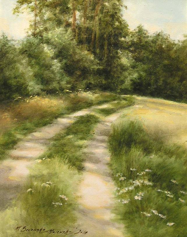 Na obrazie widać urokliwą leśną ścieżkę, wijącą się między bujną zielenią drzew i łąki. Kolory są delikatne, pastelowe, z przewagą zieleni i złamanej bieli, które nadają krajobrazowi spokojny, sielankowy charakter. Ścieżka prowadzi w nieznane, a otaczające ją trawy i kwiaty dodają kompozycji lekkości. Nastrój obrazu jest niesamowicie peaceful. Czuć w nim spokój i harmonię natury. Artysta posługuje się miękkimi pociągnięciami pędzla, tworząc efekt rozmycia, który sprawia, że obraz wydaje się niemalże mglisty. Technika ta przywodzi na myśl impresjonizm, choć jest bardziej wyważona i mniej spontaniczna. Światło gra tu ogromną rolę, subtelnie przenikając przez liście drzew i rozświetlając ścieżkę oraz łąkę. Obraz może wywoływać różnorodne emocje. Może przypominać dzieciństwo pełne beztroskich dni spędzonych na wsi, albo po prostu zapraszać do chwili refleksji nad pięknem przyrody. "Jaki fajny obrazek" - powiedziałoby zapewne dziecko. Stojąc przed tym dziełem, odczuwam pewną tęsknotę za naturą, jakby obraz mówił: "Chodź, odpocznij chwilę". To tak, jakby artysta chciał uchwycić esencję "home".