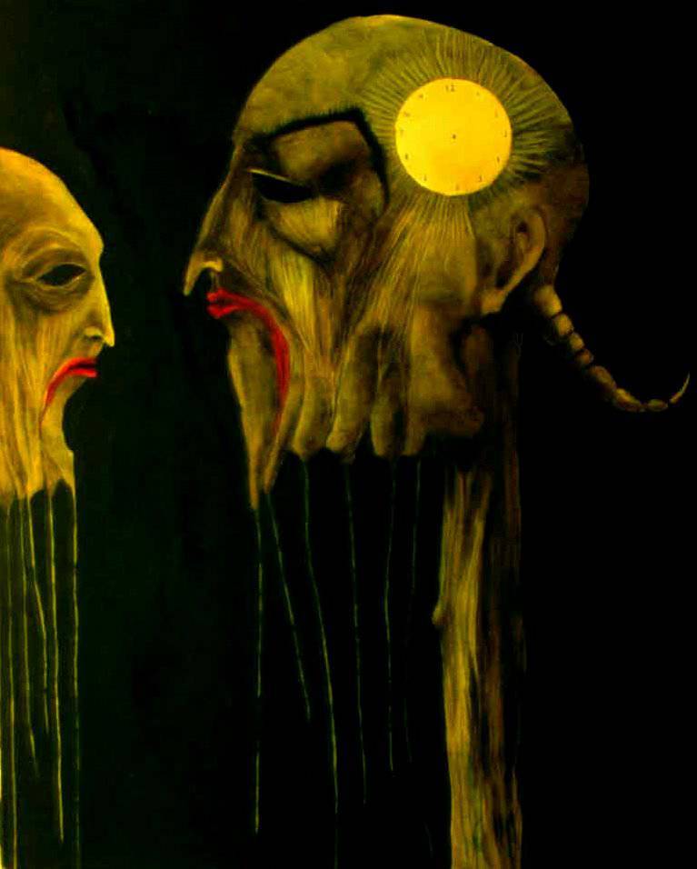 Obraz przedstawia dwa tajemnicze oblicza, zawieszone w mrocznej, niemal czarnej przestrzeni. Dominują tu intensywne, ciemnozielone barwy, przeplatane odcieniami złota i czerwieni, które dodają dziełu niepokojącej tajemniczości. Kompozycja jest asymetryczna, podkreślając niepokój i zaskoczenie. Twarze, przekształcone niemal w surrealistyczny sposób, przyciągają wzrok swoją dziwacznością. Z jednej strony widzimy przypominające zegar słońce, które jakby zatrzymało czas, a z drugiej - strużki barw spływające ku dołowi. Jest tu coś surreal, co wzbudza ciekawość i niepewność. Atmosfera obrazu jest ciężka, niemal dusząca, z nutą melancholii. Artysta zastosował technikę impresjonistyczną z elementami grozy, nadając rysom twarzy wydłużone, abstrakcyjne formy. Na pierwszy rzut oka, można poczuć się niekomfortowo, jakby dzieło patrzyło w głąb naszej duszy. Kolory są ciemne, prawie jak noc, a zepsute czerwienią usta dodają tajemniczego dramatyzmu, kontrastując z resztą kompozycji. Patrząc na to dzieło, czuję, jakby artysta chciał przekazać coś o przemijaniu czasu albo o nieuchronności losu. Kiedy patrzysz na nie, nie możesz oderwać oczu, zastanawiając się, co właściwie się tu dzieje. Dziecko by powiedziało, że to są twarze dziwnych morskich potworów, co jest całkiem sweet. To obraz, który może wywołać w odbiorcy mieszankę fascynacji i niepokoju, pozostawiając go z pragnieniem odkrycia skrytej opowieści.