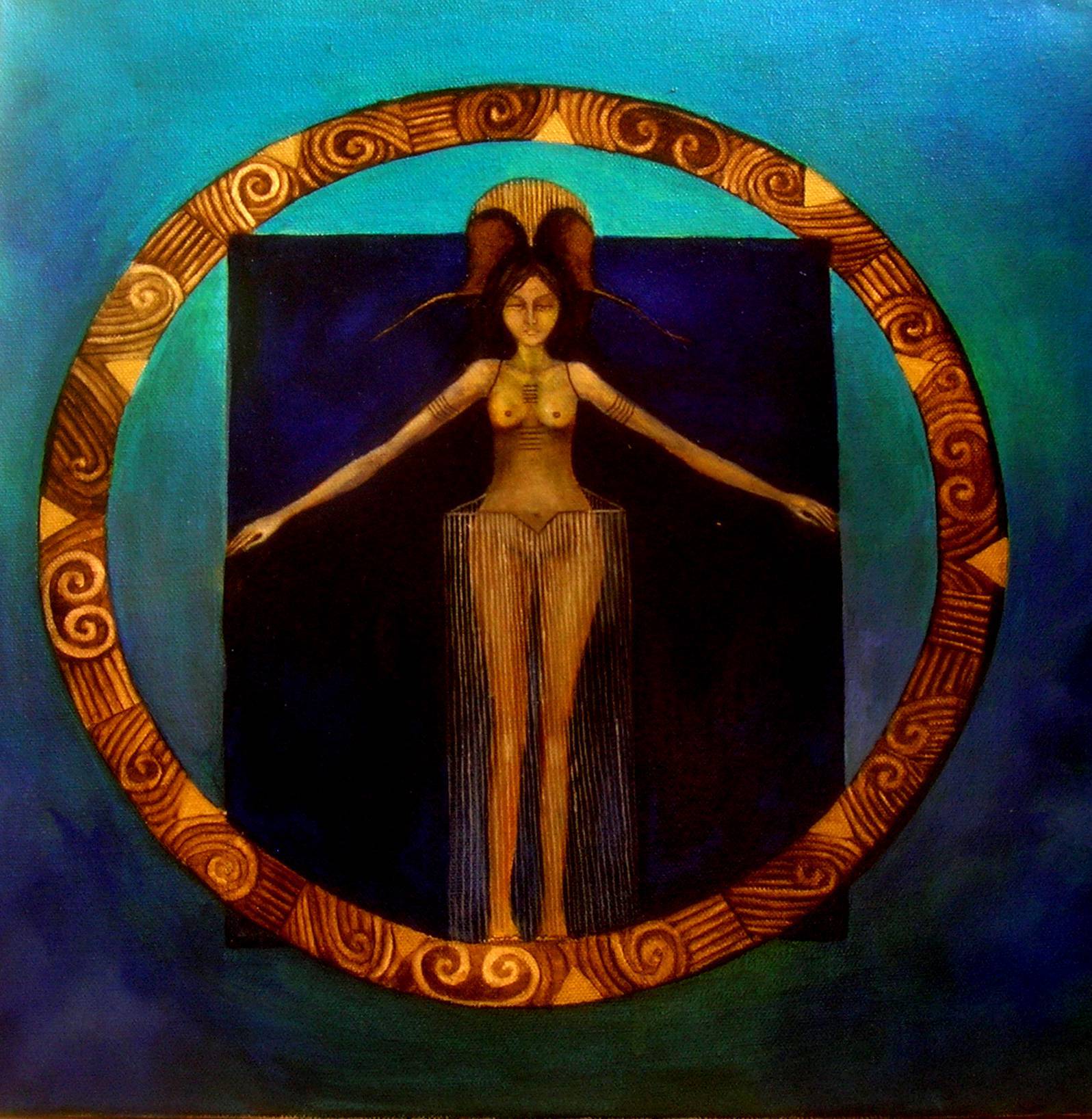 Na obrazie widać postać kobiecą otoczoną złotym kręgiem, co nadaje dziełu mistycznego charakteru. Dominują tu głębokie odcienie błękitu i brązu, które kontrastują z jaśniejszymi elementami, tworząc dynamiczną kompozycję. Krąg zdobią spiralne wzory, które przywodzą na myśl starożytne symbole. Postać wydaje się lewitować, co dodaje całości atmosfery tajemniczości. To takie magiczne! Artysta zastosował technikę olejną, dzięki czemu kolory są intensywne i pełne głębi. Styl obrazu można określić jako surrealistyczny, bo gdzieś tam unosi się nuta niepewności. Widz, patrząc, może poczuć pewną tęsknotę za zrozumieniem ukrytego przesłania. Czy to odwieczna walka między wnętrzem a zewnętrznym światem? Kto wie! Obraz może budzić emocje refleksji i zamyślenia. W głowie rodzą się pytania: Kim jest ta postać, gdzie ona zmierza? Kompozycja intryguje, a złoty krąg wciąga nas w swoje "magic" wnętrze. Osobiście czuję, że to jak wciągające spojrzenie w nieskończoność. Cała scena wydaje się być w zawieszeniu, jakby czas zatrzymał się na chwilkę. Artysta bawi się formą i kolorem, tworząc dzieło, które jednocześnie uspokaja i niepokoi.