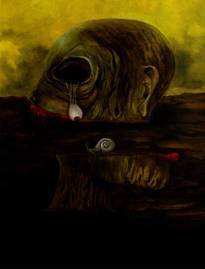 Obraz ukazuje surrealistyczną scenę z głową wyłaniającą się z ciemnej tafli wody. Kolory na płótnie są stonowane, dominują żółcie, brązy i czernie. Głowa ma wyraz zgnębienia, z oczu ciekną łzy niczym krople deszczu. Na kojącej fali spoczywa mały ślimak, wprowadzając nutkę delikatności w tę mroczną kompozycję. Atmosfera obrazu jest ciężka, pełna tajemnicy, może nawet smutku. Artysta zastosował techniki cieniowania, które dodają głębi i wzmacniają wrażenie trójwymiarowości. Aż chce się zawołać: "Wow, co to wszystko znaczy?". Obraz wywołuje uczucie niepokoju, ale też refleksji nad istotą ludzkiego cierpienia i kruchości. Każdy element zdaje się krzyczeć: "Pomyśl nad tym!". Ślimak, choć mały, wydaje się odgrywać ważną rolę. To taki mały bohater codzienności. Można wręcz usłyszeć szepty tajemnicy unoszące się w powietrzu. Mały ślimak wędruje przez wielką głowę. Styl artysty to połączenie surrealizmu z elementami ekspresji. A wszystko to jest takie... haunting. Wizualnie przyciągający, obraz pozostawia widza z pytaniami i uczuciem niepewności. Dlaczego płaczemy i co to znaczy dla nas? To scena, która każe zatrzymać się na chwilę i przemyśleć głębsze znaczenia życia.