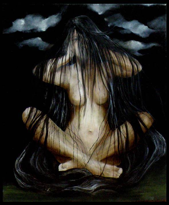 Obraz przedstawia siedzącą postać z długimi, ciemnymi włosami, które zasłaniają jej twarz. Kolory są stonowane, dominują czernie i brązy, a na tle widać ciężkie, ciemne chmury. Kompozycja centralna, skupiająca uwagę na postaci, która wydaje się skrywać przed światem. Atmosfera obrazu jest melancholijna, tajemnicza. Mroczny nastrój emanuje z dzieła, przypominając senne koszmary lub chwile głębokiej zadumy. Artysta użył realistycznych technik malarskich, co dodaje dziełu intensywności. Wydaje się, jakby postać sama była częścią tych mglistych cieni. Oglądając to, można poczuć swoistą izolację. Interpretacja? Może być różna. Dla jednych to symbol zagubienia, dla innych akt buntu przed światem. Dziecko mogłoby powiedzieć: „Ona ma długie włosy jak księżniczka”. Jest tu coś personalnego, jakby artysta chciał, byśmy zobaczyli fragment jego duszy. Wszystko jest unikalne, jakby przygoda życia była na horyzoncie. Ciekawe, prawda?