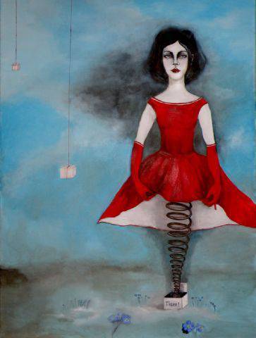 Obraz ukazuje postać kobiety w czerwonej sukni, unoszącej się na sprężynie jak zabawka z pudełka. Intensywny kontrast czerwieni sukni z błękitnym tłem przyciąga wzrok, tworząc surrealistyczną aurę. Dominujące kolory to chłodny błękit i głęboka czerwień, wzmacniając wrażenie tajemniczości i niepokoju. Kompozycja jest minimalistyczna, z delikatnym efektem tajemniczych oparów w tle i unoszącymi się kostkami. Takie elementy budują atmosferę nieco snu lub dziwacznej baśni. Artysta zastosował technikę oleju, co nadaje fakturę i głębię obrazowi. Nastrój jest jednocześnie niepokojący i hipnotyzujący. Miks formalności i odrobiny szaleństwa. Można poczuć się jak w bajce, ale tej z mrocznym twistem. Czuć jakieś secret whispers unoszące się z obrazu. To trochę jakby ulubiona bajka dzieciństwa stała się lekko koszmarna. Dziewczynka na sprężynie wywołuje uczucie klaustrofobicznej zabawy, jakby ktoś w dziecięcy świat wpuścił cień dorosłego życia. Dla 7-letniego dziecka: "Pani w czerwonej sukience ma sprężynowe nogi!" I to wszystko sprawia, że obraz jest niezapomniany, odrywa się od rzeczywistości, przenosi w świat, gdzie zabawki mogą ożyć. Dzięki niemu można odkrywać nowe emocje i zastanawiać się nad granicą między jawą a snem. Fascynujący i niepokojący zarazem.
