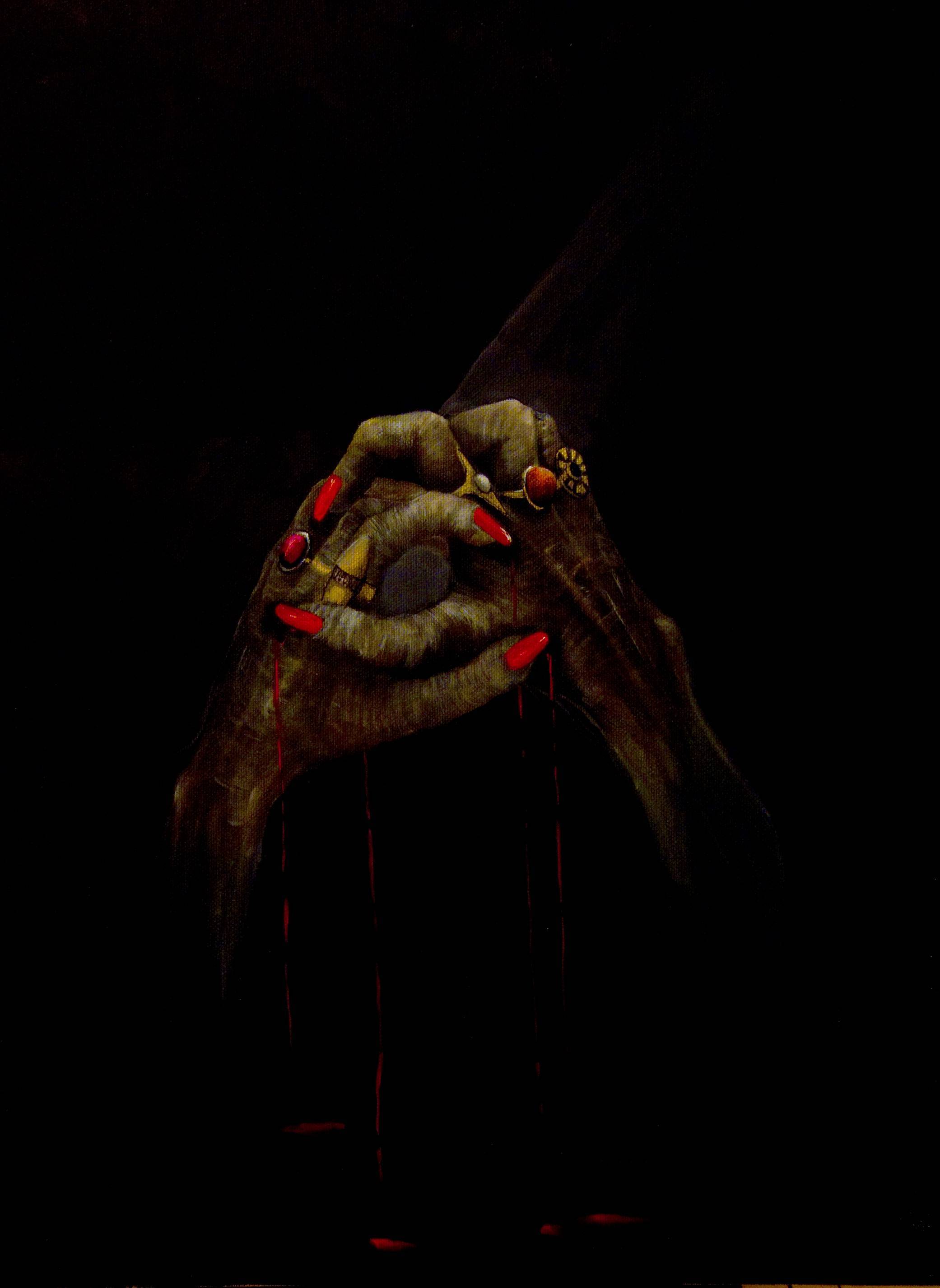 Na obrazie widzimy złożone dłonie o wydłużonych, czerwonych paznokciach, które wyłaniają się z głębokiego, niemal czarnego tła. Dłonie, ozdobione licznymi pierścieniami z różnymi kamieniami, wyglądają na surowe i tajemnicze, jakby wychodziły z cienia. Czerń otoczenia nadaje całości mrocznego klimatu, wzmacniając poczucie niepokoju i tajemnicy. Obraz emanuje atmosferą grozy i intrygi, a krople czerwieni mogą symbolizować ból czy ofiarną krwawicą - kto wie. Styl dzieła jest realistyczny, z precyzyjnym wykorzystaniem światła i cienia. Technika artystyczna sugeruje dbałość o szczegóły, co podkreśla dramatyczność sceny. Oglądając dzieło, można poczuć dreszcz, jakby jakaś nieznana siła chciała coś przekazać. Dla siedmiolatka obraz może być nieco przerażający - "Mamooo, te ręce są straszne!" Taki emocjonalny rollercoaster, prawda? A może to tylko myśli artysty zamknięte w rzeźbie światła i mroku. Z pewnością obraz prowokuje do refleksji. Coś jak ciągłe balansowanie między dark a light, dobro a zło. Idealnie nadaje się do długich rozmów o znaczeniu ukrytych motywów.