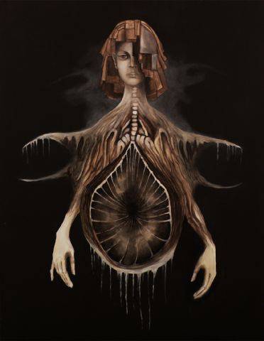 Obraz prezentuje intrygującą postać na ciemnym tle, a kontrast między czarnym tłem a jasnymi elementami postaci przykuwa uwagę od pierwszego wejrzenia. W centralnym punkcie kompozycji widzimy tajemniczą, humanoidalną formę o ciele, które zdaje się być w połowie fleszem, a w połowie organiczną strukturą. Kolory oscylują między bladymi beżami a brązami, co nadaje dziełu surrealistycznego, nieco niepokojącego charakteru. Całość emanuje atmosferą tajemnicy i pewnego rodzaju smutku. To jakby wejść w inny świat, pełen nieodkrytych emocji. Technicznie, artysta używa detali i tekstur, które tworzą iluzję trójwymiarowości, jednocześnie nadając całości eteryczny, niemalże duchowy wymiar. Przyciągające oczy detale, takie jak skrzydlate formy i strukturalne elementy przypominające gałęzie, każą odbiorcy zastanowić się nad esencją tej postaci: kim jest, skąd pochodzi? Obraz wywołuje mieszankę emocji: od podziwu do niepokoju. Można poczuć, jakby był to fragment z innego snu, część czegoś większego. To dzieło pobudza wyobraźnię, zachęcam do głębszej refleksji. "Why?", pyta naszą świadomość. Oglądając, można wręcz usłyszeć szepty i dźwięki, które towarzyszą tej postaci w jej tajemniczym świecie. Wszystko wydaje się być zawieszone w czasie, nieuchwytne. Podsumowując, obraz ten jest emocjonalną podróżą w nieznane, pełną pytań bez odpowiedzi.