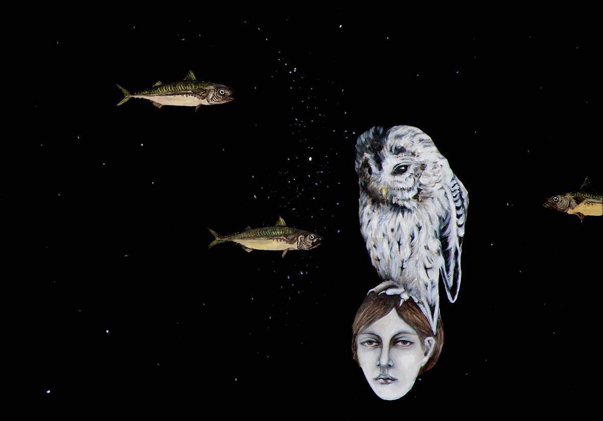 Obraz na czarnym tle, jakby wyjęty z kosmicznego snu, przyciąga wzrok swoją surrealistyczną kompozycją. Po prawej stronie widzimy sowę, której pióra miękko opadają w dół, będąc jednocześnie na głowie kobiety o kamiennej twarzy. Światło odbija się na ich powierzchni, tworząc delikatne refleksy. To jakby połączenie dwóch światów - dzikości i spokoju. Pomiędzy nimi pływają ryby, niemal lewitujące w przestrzeni. Ich zielono-brązowe łuski kontrastują z głęboką, czarną nicością. Atmosfera jest tajemnicza, enigmatyczna, a może nawet trochę niepokojąca. Czuć powiew oniryzmu, jakbyśmy śnili na jawie. Artysta użył techniki mieszanej, może akwareli z delikatnym tuszem, by nadać obrazowi lekkości i ulotności. Bajkowy wpływ i dreamlike quality dzieła sprawiają, że można poczuć się trochę jak dziecko patrzące na magiczne światy. "Ja też chcę dotknąć tej sowy!" - pomyślałem. Emocje, jakie wywołuje, to nostalgia, refleksja nad zagadkowością życia. Obraz prowokuje do zadumy, zachęca, by przystanąć na chwilę i zastanowić się, co ta niecodzienna kombinacja symboli dla nas znaczy.