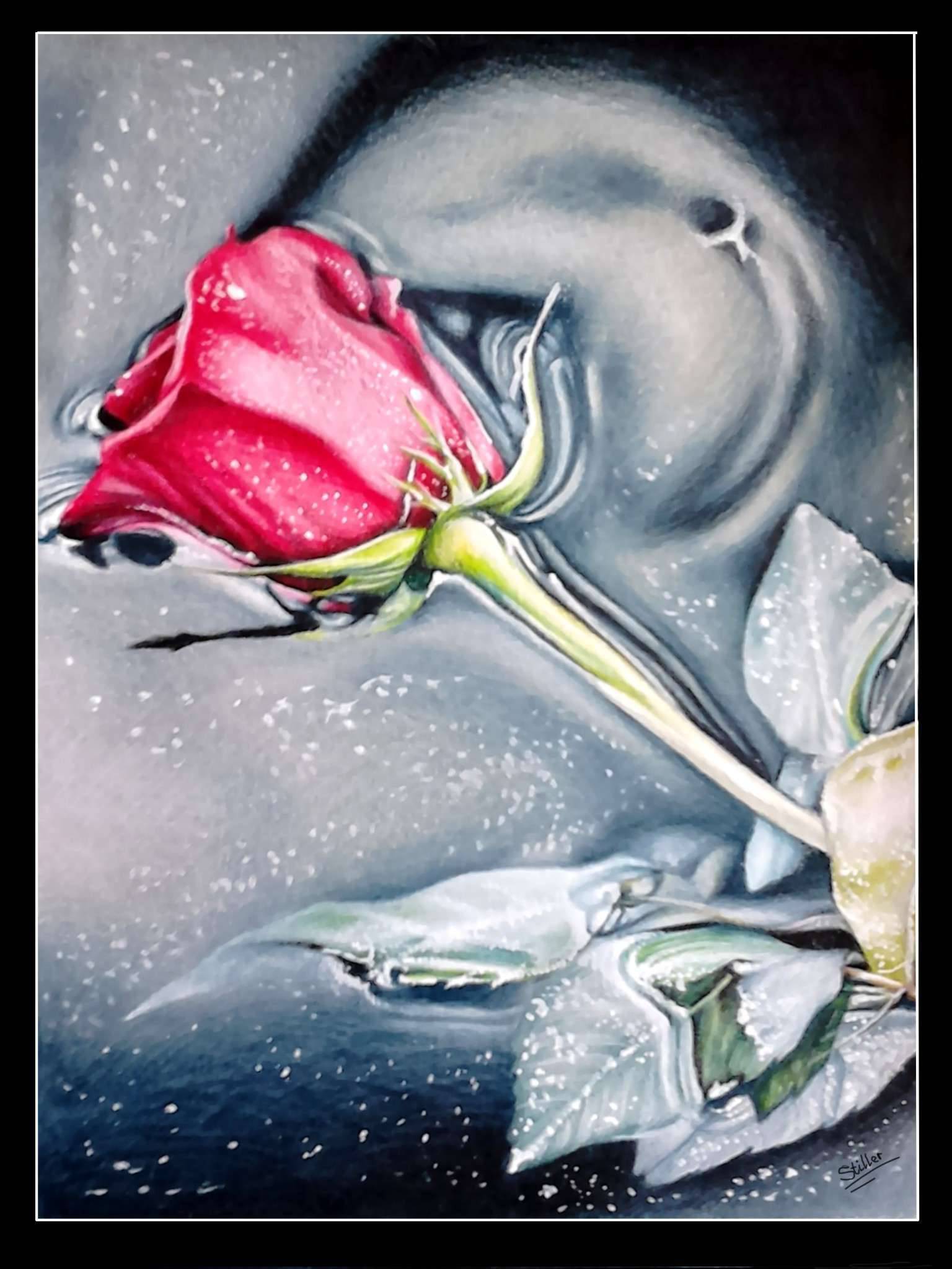 Na obrazie widzimy cudowną czerwoną różę unoszącą się delikatnie na powierzchni wody. Krople na płatkach błyszczą niczym diamenty, dodając kompozycji elegancji i subtelności. Tło jest tajemnicze, szaroniebieskie, przypominające gęstniejący mrok nocy. Liście róży odcinają się chłodnymi odcieniami zielonego, a wokół nich widać niewielkie białe punkciki, jakby padał magiczny deszcz. Atmosfera zdecydowanie tajemnicza, niemal dreamlike, co przyciąga wzrok i pobudza wyobraźnię. Artysta posłużył się techniką, która przypomina hiperrealizm, uwydatniając detale w sposób niemal fotograficzny. Ten styl sprawia, że róża wydaje się wręcz dotykalna. Obraz wywołuje emocje nostalgii i refleksji, zmuszając do zatrzymania się na chwilę, by docenić jego piękno. Patrząc na tę różę, można pomyśleć o przemijaniu oraz o tym, jak chwile ulotne i wyjątkowe są zarazem. Historia, którą opowiada obraz, jest taka jak opowieść małego dziecka: "Patrz, jaka piękna różyczka na wodzie pływa!" Ta prosta, dziecięca radość oddaje coś, co czasem umyka dorosłym. Czy to smutek, czy raczej pogoda ducha? Odpowiedź zależy od tego, kto patrzy. Ten obraz to małe arcydzieło, które porzeka w nas najskrytsze uczucia i pozwala ponownie odkrywać magię w codzienności.