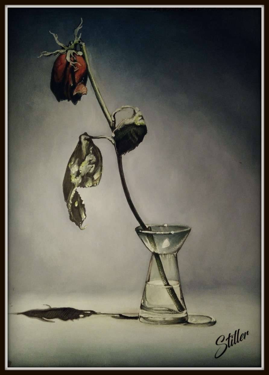 Na obrazie widzimy zwiędniętą różę w szklanym naczyniu. Róża ma głęboki, ciemnoczerwony kolor, który kontrastuje z jasnym tłem. Liście, jakby przykurzone i zmęczone, zwisają smętnie, tworząc melancholijną atmosferę. Tło jest delikatne, niemal mgliste, co dodaje kompozycji subtelności i lekkości. Naczynie jest proste, lecz eleganckie, wykonane z przejrzystego szkła, które odbija światło, dodając scenie nieco blasku. Artysta, stosując technikę realistycznego malarstwa, umiejętnie oddaje detale kwiatu i jego otoczenia. Piórkiem malowane pociągnięcia farby, precyzyjnie odwzorowują strukturę płatków i liści. Całość emanuje spokojem, ale jednocześnie nutą smutku. Jakby róża opowiadała historię przemijania. Obraz może wywoływać szereg emocji. Jest coś pięknego w tej pozornej prostocie i nostalgii. Dzieło przypomina o kruchości życia i nieuchronnym upływie czasu. Kiedy na nie patrzę, czuję tęsknotę za chwilami, które minęły. To trochę jak nostalgia za utraconym "beauty" życia. A dziecko by powiedziało: „Róża jest smutna, bo nie ma wody”. Ten obraz, mimo swojej prostoty, potrafi zahaczyć o głębokie struny w duszy każdego, kto na niego spojrzy.