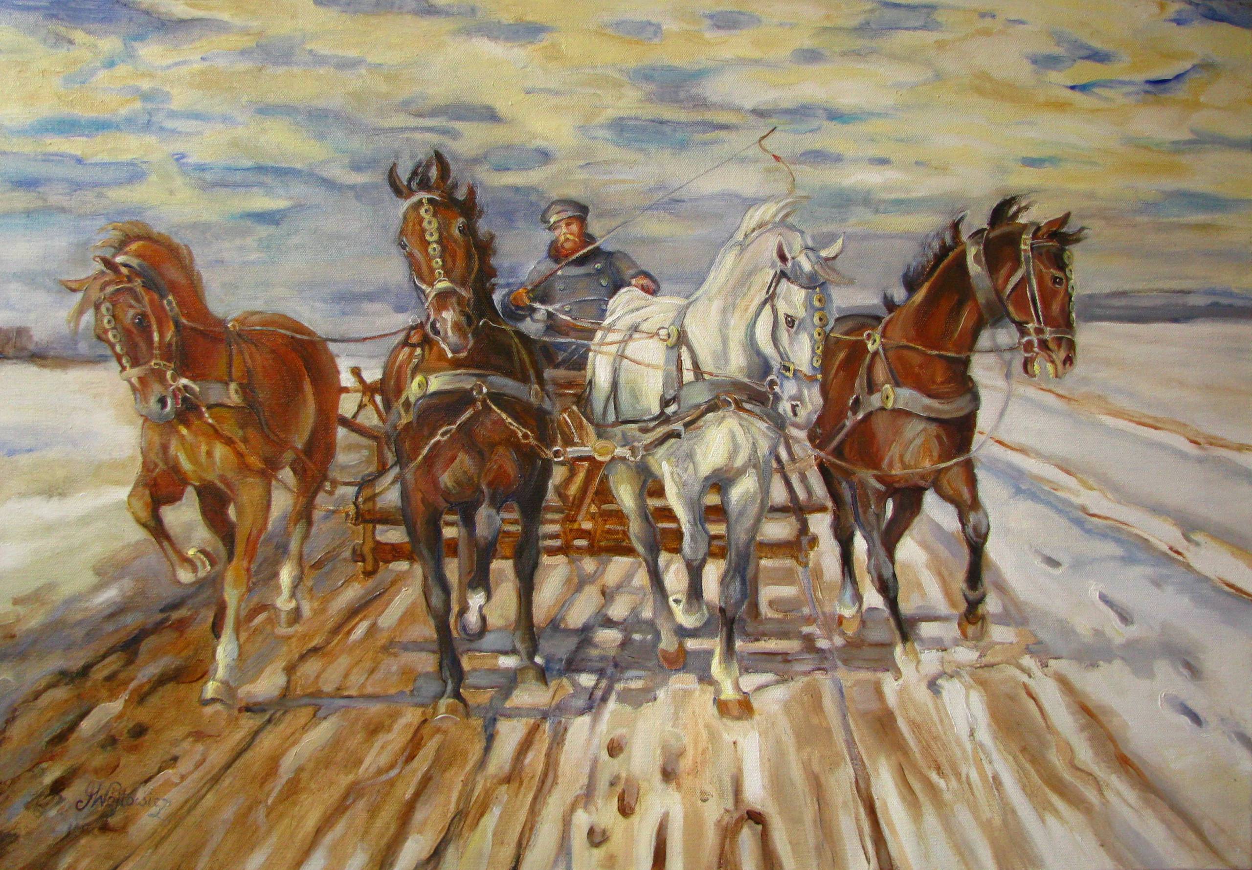 Na obrazie widać scenę zimową, pełną energii i ruchu. Cztery konie, dwa brązowe i dwa białe, ciągną sanie po ośnieżonej, drewnianej drodze. Artysta używa ciepłych i chłodnych kolorów, kontrastując zimowe tło z dynamiczną grupą zwierząt. Całość kompozycji sprawia wrażenie ruchu, można prawie poczuć wiatr na twarzy. Nastrój dzieła jest pełen dynamiki i przygody. Technika malarska artysty to realistyczne, ale pełne emocji ujęcie. Pociągnięcia pędzlem oddają teksturę śniegu i lśniące futro koni. Obraz ten wywołuje u odbiorcy uczucie podziwu dla siły natury. Patrząc na niego, czujemy przypływ "adrenaline", jakbyśmy sami byli uczestnikami tej eskapady. "Konie są jak duże psy, tylko większe" - tak mógłby powiedzieć mały obserwator. Obraz skłania do refleksji nad pięknem prostoty życia oraz współpracy człowieka z naturą. Każdy detal zdaje się przypominać o przygodach, które czekają tuż za rogiem.