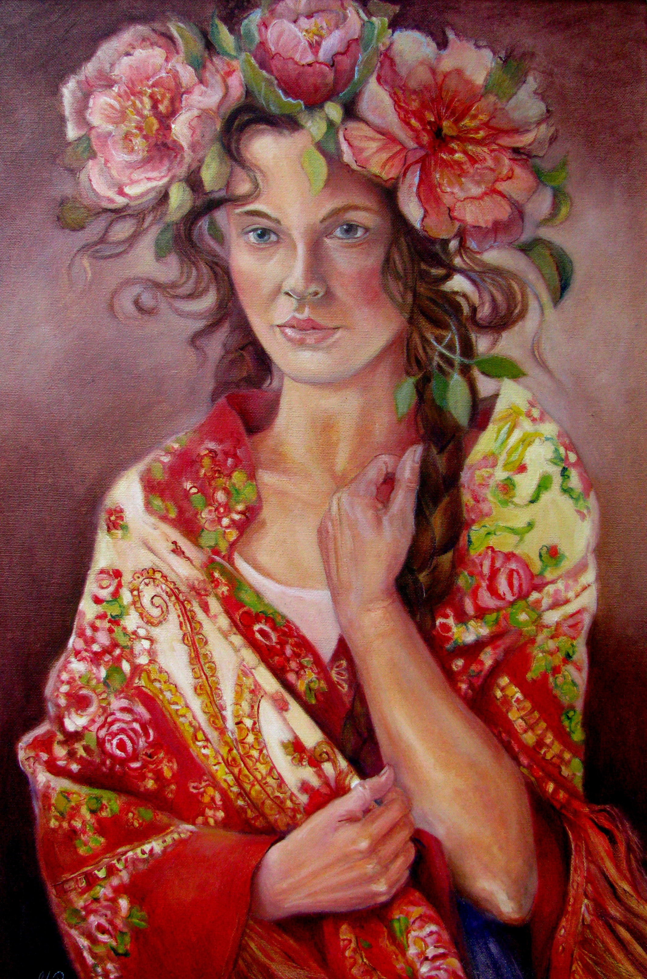 Obraz przedstawia młodą kobietę, otuloną w kolorowy szal. Na jej głowie widnieje wieniec z dużych, różowych kwiatów. Ich delikatne, pastelowe odcienie tworzą harmonijny kontrast z intensywną czerwienią i bogactwem wzorów na szalu. Kompozycja jest wyważona, a kobieta patrzy prosto przed siebie, co dodaje portretowi intymności i skupienia. Artysta używa subtelnych pociągnięć pędzla, co nadaje dziełu miękkości. Styl jest klasyczny, przypominający dawne malarstwo portretowe. Atmosfera obrazu jest spokojna, niemal baśniowa. To jakby zatrzymany moment z innej epoki. Kobieta wydaje się zamyślona, a jej spojrzenie można interpretować na wiele sposobów – może tajemnica, nostalgia? Może coś innego. Motywy kwiatowe przywołują na myśl naturalne piękno i prostotę. Patrząc na obraz, czujemy ciepło i pewną melancholię, jakbyśmy wrócili do dawno zapomnianych wspomnień. Wow, jakie to magiczne! (mówi dziecko). Dzieło może wywoływać różnorodne emocje – od zachwytu nad kunsztem wykonania, po osobiste refleksje na temat ulotności chwili. Jak przykuwa uwagę, prawda? To, co wyróżnia ten obraz, to połączenie tradycji z nowoczesnością – taki artystyczny twist. Wśród codziennego chaosu, to przypomnienie o pięknie i spokoju, które możemy znaleźć w prostych rzeczach. I to jest właśnie magic.