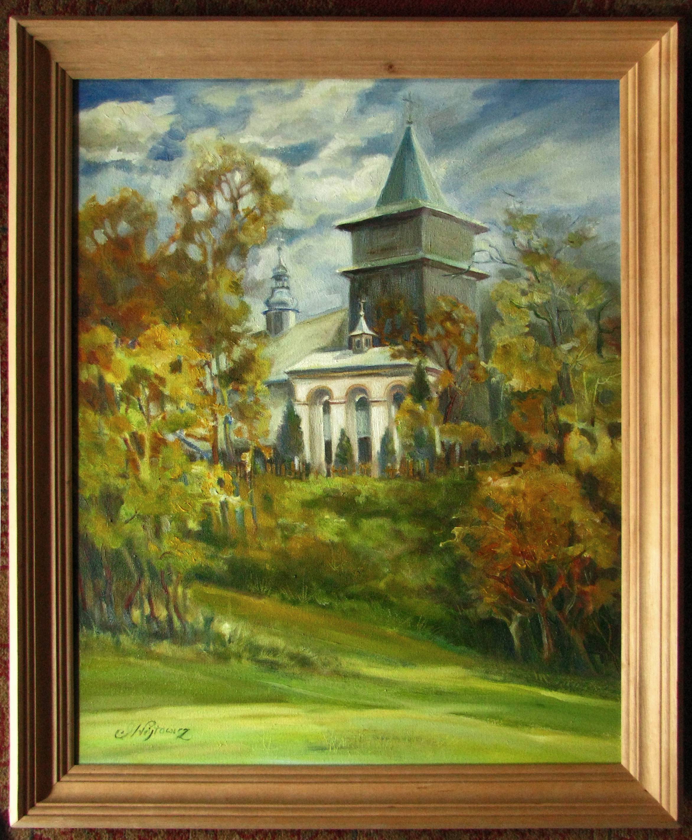 Obraz przedstawia drewniany , zabytkowy kościół w Marcyporębie