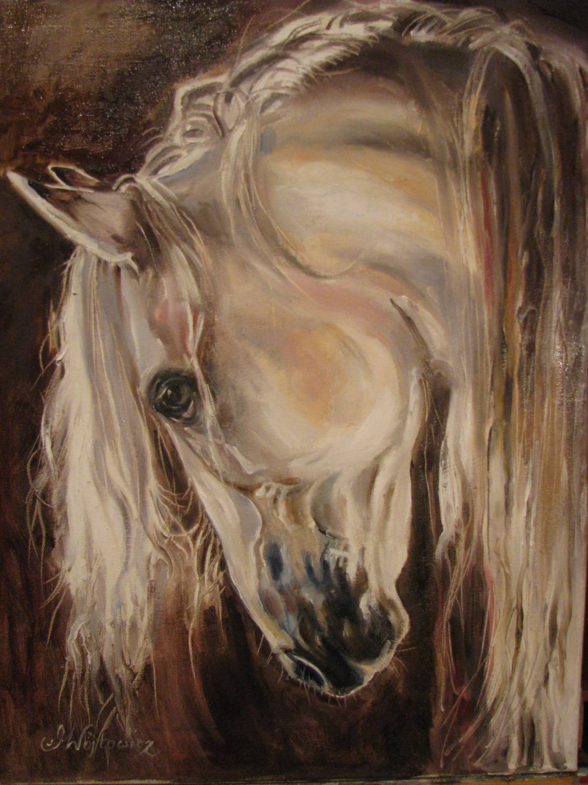 Na obrazie widzimy pięknego białego konia z pochyloną głową. Jego grzywa opada kaskadami, jakby była z płynnego srebra. Tło w odcieniach brązu i beżu podkreśla delikatność sylwetki zwierzęcia, dając wrażenie spokoju i elegancji. Kolory są stonowane, ale jednac pełne subtelnej głębi. Atmosfera na obrazie jest spokojna i refleksyjna. Artysta użył miękkich pociągnięć pędzla, by oddać delikatne przejścia między odcieniami, co nadaje całości wrażenie płynności i lekkości. It's like watching a dream unfold. Widząc obraz, czuje się majestat i delikatność konia. Każdy drobny szczegół wydaje się namalowany z wielką pieczołowitością. Można odnieść wrażenie, że koń zaraz wyjdzie z obrazu i zacznie wędrować po pokoju. Malowanie takie może wywołać u odbiorcy poczucie nostalgii za czasami, gdy życie było prostsze. Jak mówiłby 7-latek: koń ma śliczne oczy. Styl obrazu przypomina impresjonizm z domieszką realizmu, co sprawia, że jest on porywający.