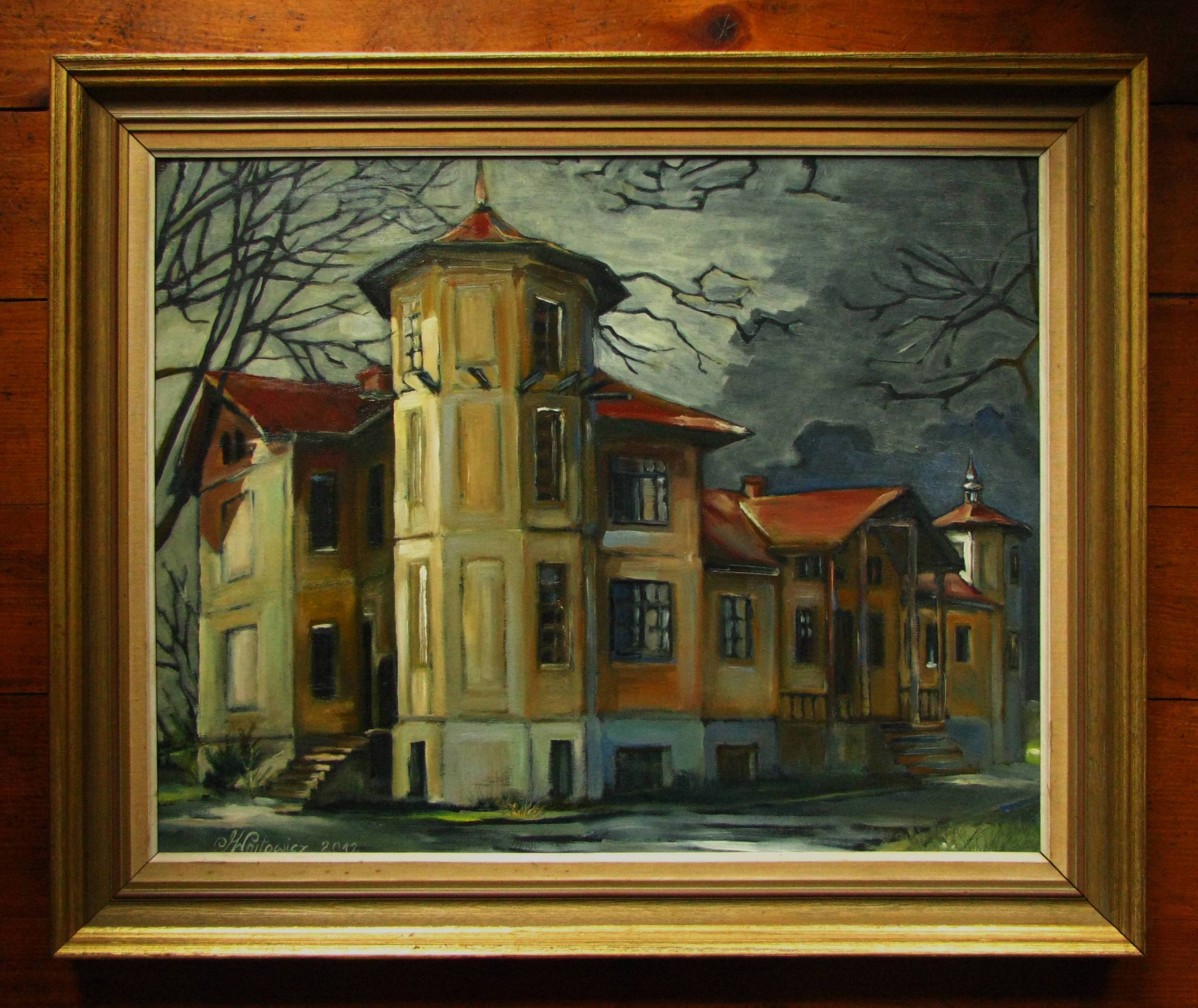 Obraz przedstawia stary dom z czerwonymi dachami, wtulony w otoczenie nagich, wijących się gałęzi drzew. Kolory są stonowane, z przewagą szarości i brązów, ale dachy ożywiają scenę mocnym, ciepłym akcentem. Kompozycja jest skupiona na centralnej bryle budynku, który wydaje się być świadkiem wielu minionych historii. Atmosfera obrazu tchnie pewnym tajemniczym klimatem. Można poczuć, że ten dom skrywa jakieś sekrety. A może nawet duchy? Mroczne, zachmurzone niebo dodaje grozy i przywodzi na myśl opowieści z dreszczykiem. Czuje się tu pewną nostalgiczną nutę przemijania. Artysta użył malarskich technik olejnych, które nadają dziełu głębokości i tekstury. Pociągnięcia pędzla są wyraźne, dając widzowi poczucie dynamizmu. To, co widać, wydaje się realne, choć odrobinę przedstawione z punktu surrealizmu. Obraz może wywoływać u odbiorcy refleksje nad czasem i jego nieubłaganym upływem. Z drugiej strony, dziecko mogłoby powiedzieć: "To dom jak z bajki, gdzie mieszkają czarodzieje!" Całość jest niezwykle engaging, zachęcając do poszukiwania opowieści ukrytych w murach i gałęziach. Dla mnie, patrzenie na to dzieło to trochę jak czytanie książki detektywistycznej, gdzie każda szczelina muru to hint do rozwikłania zagadki. Fascinating, nieprawdaż.