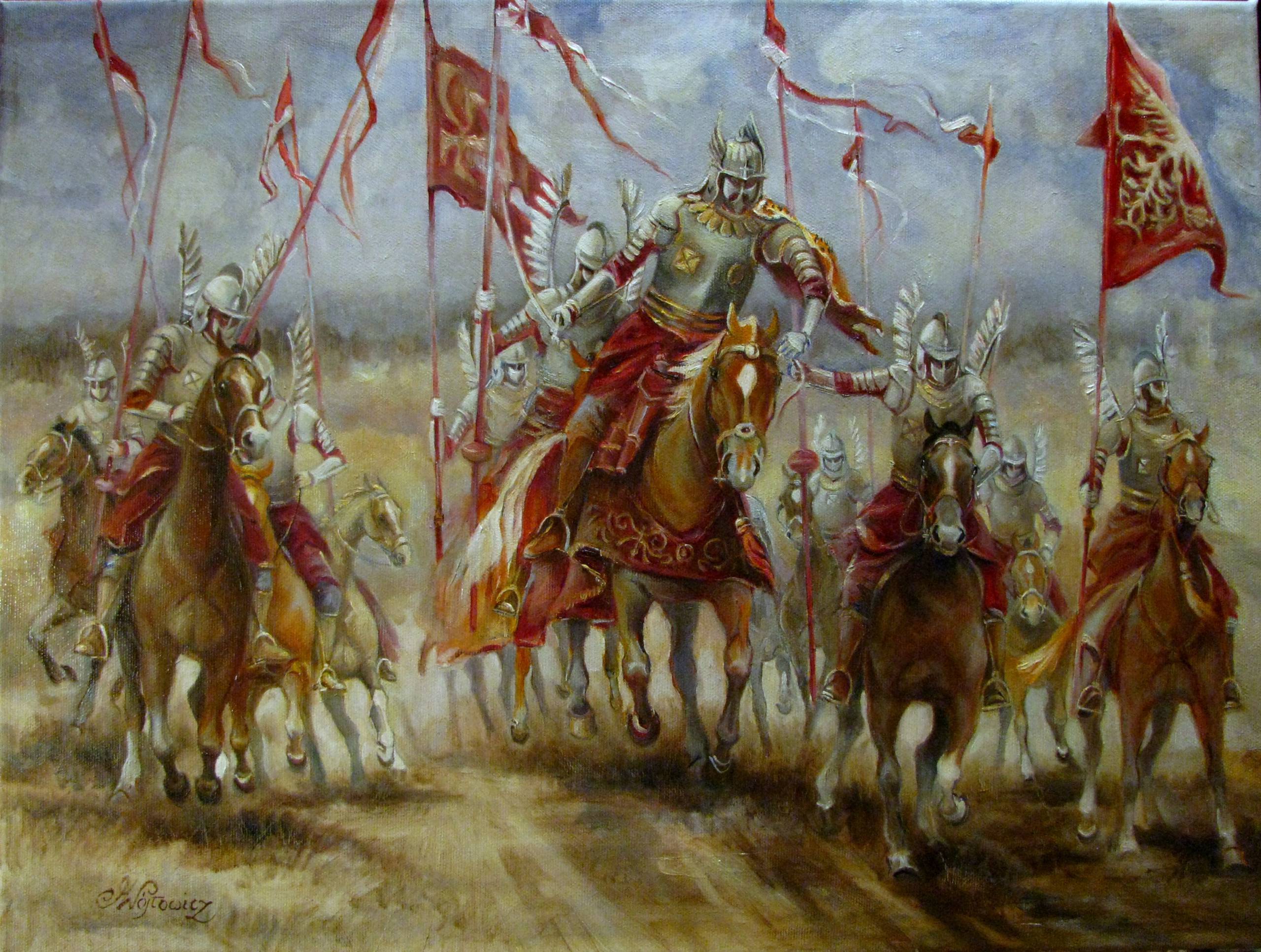 Obraz przedstawia dynamiczny marsz husarzy, którzy pędzą na swoich koniach w pełnej zbroi. Kolory to głównie odcienie szarości, złota i czerwieni, co nadaje scenie dramatyczny wymiar. Sylwetki rycerzy są majestatyczne, a ich pióropusze dodają im dostojności i siły. Czujesz, że zaraz coś się wydarzy, jakaś historyczna bitwa, epic moment. Kompozycja jest zorganizowana w trójkąt, gdzie centralna postać wysuwa się naprzód, prowadząc całą grupę. Technika malarska jest bogata w detale, każdy koń i wojownik wydają się być starannie odwzorowani. Atmosfera obrazu jest pełna napięcia i adrenaliny. Można niemal usłyszeć tętent kopyt i szelest sztandarów. Obraz emanuje siłą, determinacją i nieustępliwością. Styl artystyczny to klasyczny realizm, ale z nutką romantyzmu, co podkreśla emocjonalny ładunek dzieła. Patrząc na ten obraz, można poczuć dreszczyk emocji oraz przypływ patriotyzmu. To jak zanurzanie się w dawną epokę pełną chwały. "Ja też chcę być rycerzem!" powiedziałby pewnie malec, gdyby zobaczył ten obraz. Dzieło przypomina o potędze i odwadze, które mogą inspirować do działania. Wywołuje fascynację i podziw dla historii i spuścizny przodków.