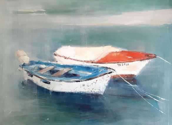 Na obrazie widzimy dwie łodzie spokojnie unoszące się na szmaragdowej tafli wody. Odcienie niebieskiego i zielonego przeplatają się, tworząc harmonijną grę kolorów. Jedna z łodzi jest biała z błękitnym wnętrzem, a druga ma akcenty czerwieni. Kompozycja jest wyważona i delikatna. Atmosfera obrazu emanuje spokojem i nostalgią. Poczujesz się jakby czas stanął w miejscu. Styl malarski jest lekko impresjonistyczny z miękkimi pociągnięciami pędzla, które nadają wodzie mglisty wygląd. Obraz może budzić w odbiorcy uczucie wyciszenia i tęsknoty za prostotą życia. "Łódki na wodzie wyglądają cool!" - powiedziałoby dziecko patrząc na tę scenę. Zastosowane kolory i techniki przypominają nam lazy afternoons nad jeziorem. Ślady pędzla widoczne na powierzchni obrazu dodają mu dynamizmu. Krótko mówiąc, to prawdziwa uczta dla oczu i duszy. Taki widok skłania do refleksji nad pięknem przyrody i jej ulotnością.