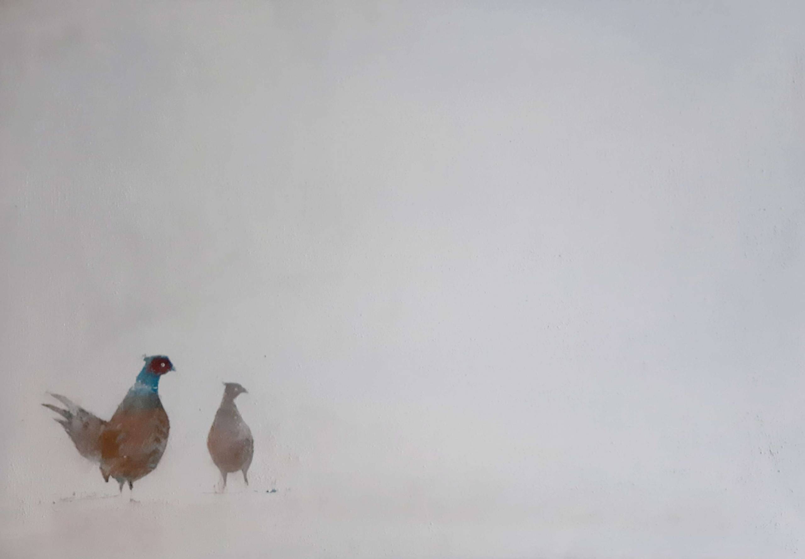 Na obrazie widać dwa ptaki, zapewne bażanty, które stoją na tle niemal zupełnie białego krajobrazu. Kolory są delikatne i subtelne, ograniczone niemal wyłącznie do odcieni brązu, z charakterystyczną niebieską plamą na głowie jednego z ptaków. Przestrzeń wokół nich wydaje się nieskończona, zupełnie jakby świat poza nimi nie istniał. Kompozycja jest minimalistyczna, ale to właśnie prostota nadaje jej pewien specyficzny "touch". Atmosfera obrazu jest spokojna, wręcz intymna. Cisza, która zdaje się emanować z kadru, przywodzi na myśl zimowy poranek, kiedy to świat jeszcze się nie obudził. Styl artysty jest impresyjny, używa on miękkiego pędzla i płynnych przejść kolorów, by oddać efemeryczną naturę chwili. Dla mnie, to dzieło wywołuje poczucie spokoju z nutką zadumy. Wyłania się z niego subtelna melancholia. Może przypominać nam o kruchości chwil i pięknie życia, zamkniętych w prostocie natury. Wyobrażam sobie, że te bażanty mogą symbolizować coś magicznego – maybe a secret message? Dla dziecka to obrazek dwóch przyjaciół na śniegu. Fascynuje, bawi, intryguje.
