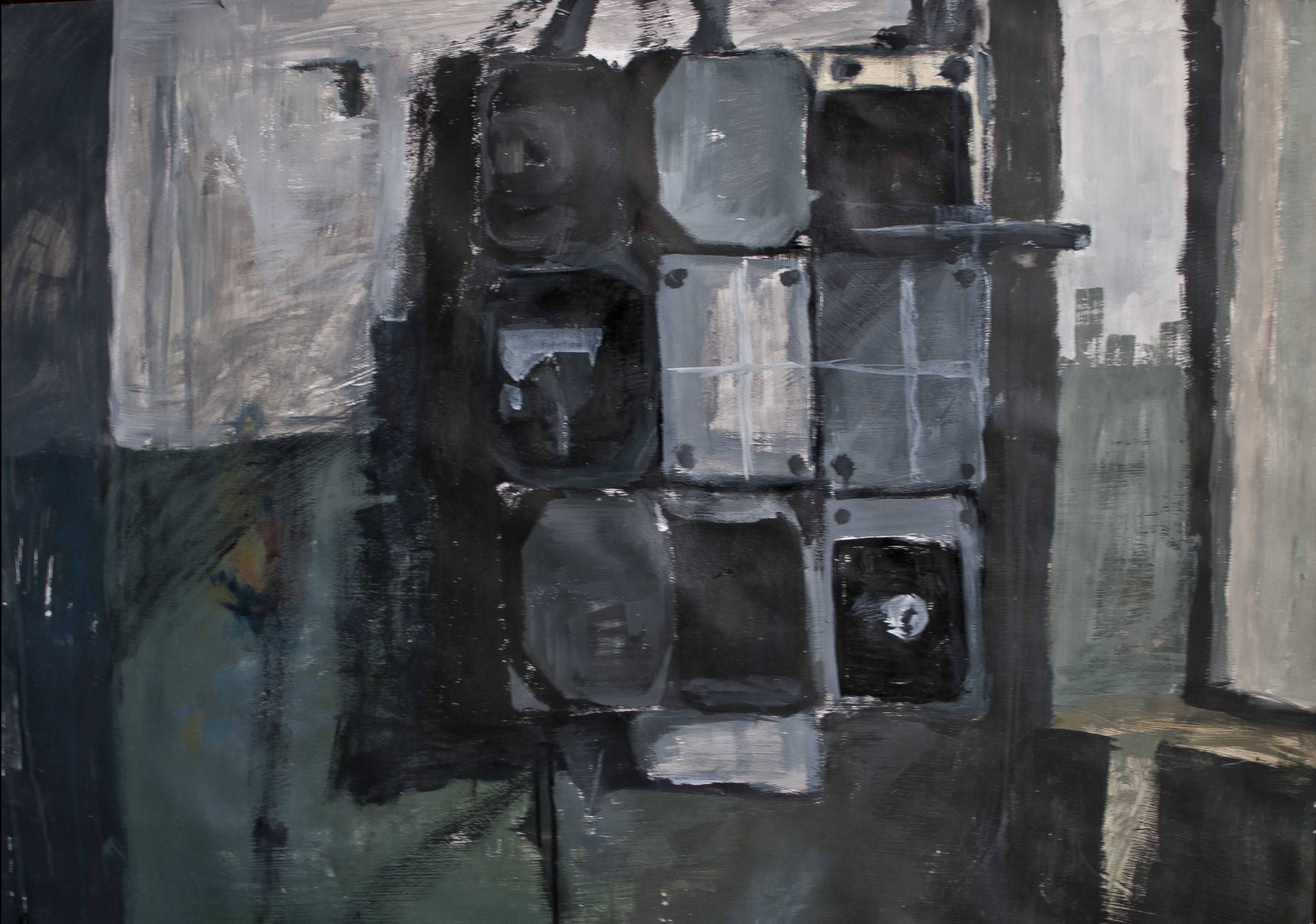 Na obrazie dominuje paleta stonowanych kolorów—odcienie szarości i zieleni. Kompozycja wydaje się być chaotyczna, ale jednak przemyślana. To jak gra cieni i świateł. Formy geometryczne, jak kwadraty i prostokąty, nakładają się na siebie. Wygląda to jak okno na świat, ale bardziej abstrakcyjne. Atmosfera jest tajemnicza, nieco melancholijna. Czuje się, jakby to był zamglony poranek, kiedy wszystko jest jeszcze półprzytomne. Jakby świat jeszcze spał. Styl wydaje się być impresjonistyczny, choć jest tu nuta abstrakcji. Pociągnięcia pędzla są wyraźnie widoczne, dynamiczne, jakby artysta malował w przypływie emocji. "Chaos, ale taki kontrolowany" — powiedziałby ktoś. Obraz może wywołać różne emocje. Dla jednych będzie to nostalgia, dla innych początek czegoś nowego. Gdzieś tam jest okienko z tajemniczą czernią, które kusi, by zajrzeć. To trochę jak tajemnicza historia, jak zagadka do rozwiązania. Wywołuje to nutkę zaciekawienia i trochę niepokoju. A wszystko to dzięki prostocie kształtów i subtelnej grze kolorów. Patrząc na to, można nie tylko widzieć, ale i czuć. I love it! Widok jest jednocześnie uspokajający i skłaniający do myślenia. Widz, jak dziecko, myśli: czy tam jest coś więcej?
