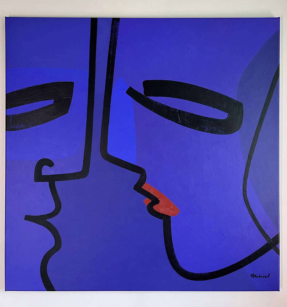 Obraz emanuje intensywnymi odcieniami niebieskiego, które dominują i tworzą spokojne, ale jednocześnie intrygujące tło. Linie są proste, czarne, wyraźne, nadają obrazowi niemal geometryczny charakter. Daje to wrażenie nowoczesności, ale też odrobinę tajemniczości. Kompozycja skupia się na dwóch twarzach, splecionych w subtelnym geście pocałunku. Ich zamknięte oczy, powierzchownie niewidoczne emocje – można niemal usłyszeć ciszę między nimi. Atmosfera obrazu wydaje się być jednocześnie intymna i refleksyjna. Styl artystyczny jest inspirowany minimalizmem, z silnym naciskiem na kontrast i formę. Technika wykorzystana przez artystę przypomina elementy cubizmu i abstrakcji. Kolory wprowadzają emocje, gdzie niebieski chłód spotyka się z ciepłem pomarańczowego akcentu ust, dodając nieco "warmth" do całej sceny. Obraz może budzić w odbiorcach różnorodne emocje – od spokoju przez nostalgię po subtelną tęsknotę za czymś nieuchwytnym. Dla dziecka, które patrzy na ten obraz, mogłoby to być coś takiego: "Widzę jak się całują i jest im dobrze". Te proste słowa oddają jego magię. Osobiście czuję, że obraz mówi o delikatnym, milczącym zrozumieniu dwojga ludzi. Wydaje się też, że ten kontrastujący minimalizm skłania do głębszej refleksji nad relacjami i emocjami, co sprawia, że człowiek zastanawia się nad sensem takich prostych, a zarazem głębokich chwil w codziennym życiu.