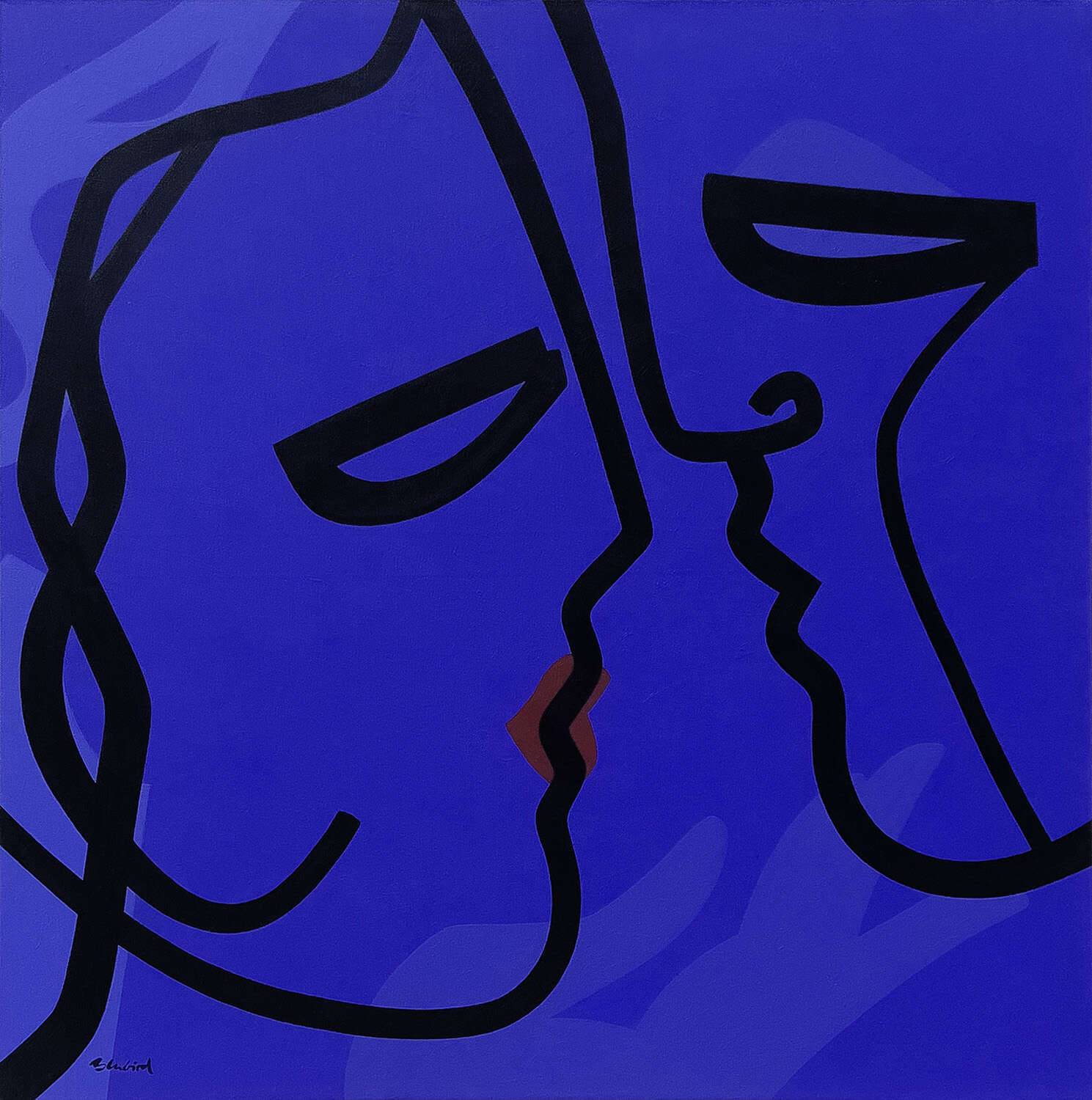 Na obrazie dominują intensywne odcienie błękitu, które wprowadzają nas do nieco surrealistycznej rzeczywistości. Proste kształty, wyrysowane czarną linią, przypominają dwie twarze zbliżające się do pocałunku. Ten kontrast między czernią a niebieskim tworzy dynamiczną kompozycję, która przyciąga wzrok. Obraz wygląda jak modern art — wspomina o prostocie i ekspresji. Czerwone usta to chyba jedyny kolor wybijający się z monochromatycznego tła, podkreślając emocjonalny wymiar dzieła. Atmosfera jest jakby zawieszona, lekko romantyczna, ale też enigmatyczna. Artysta zastosował techniki minimalistyczne, upraszczając formy do ich esencji. Ktoś mógłby powiedzieć, że obraz jest about love, z nutą tajemnicy. Dla mnie ta praca przypomina o sile prostych linii, jakby mówiła: mniej znaczy więcej. Dzieciak mógłby stwierdzić: "Oni wyglądają, jakby się zaraz mieli pocałować!". Całość wywołuje mieszankę uczuć, od intymności po ciekawość, i jakby mówiła: zatrzymaj się na chwilę i spójrz głębiej.