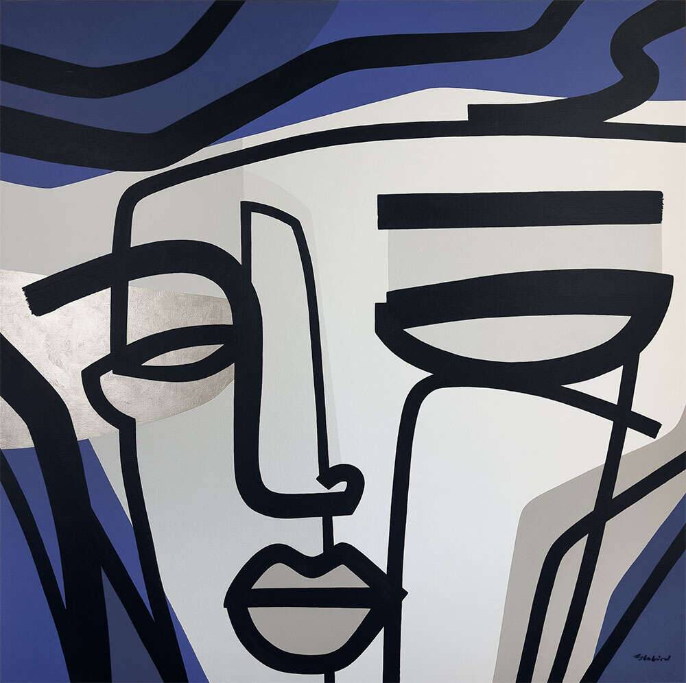 Na tym intrygującym obrazie dominują odcienie niebieskiego, szarości i czerni. Proste, ale zarazem wyraziste linie tworzą geometryczną twarz, która wciąga wzrok obserwatora. Kompozycja jest zrównoważona, z dużym kontrastem pomiędzy kształtami, co nadaje całości dynamiczny charakter. Chłodne kolory w połączeniu z surowymi liniami dają poczucie spokoju, ale także pewnej tajemniczości. Nastrój obrazu przypomina senne marzenie, gdzie wszystko wydaje się być lekko odrealnione. Artysta zastosował technikę minimalizmu, redukując formy do kilku prostych elementów, co jest zarówno nowoczesne, jak i oszczędne. Ta prostota może wywołać w widzu refleksję nad istotą sztuki: czy piękno tkwi w skomplikowaniu, czy w prostocie? Patrząc na tę twarz, można się zastanawiać, co myśli ta postać, czyżby coś nas zaskoczyło? Children would say it's a robot face! Co ja na to? Jest w tym obrazie coś fascynującego, co sprawia, że chcę się na niego patrzeć jeszcze i jeszcze. To trochę jak układanie puzzli z naszych emocji. Interesująco, prawda?