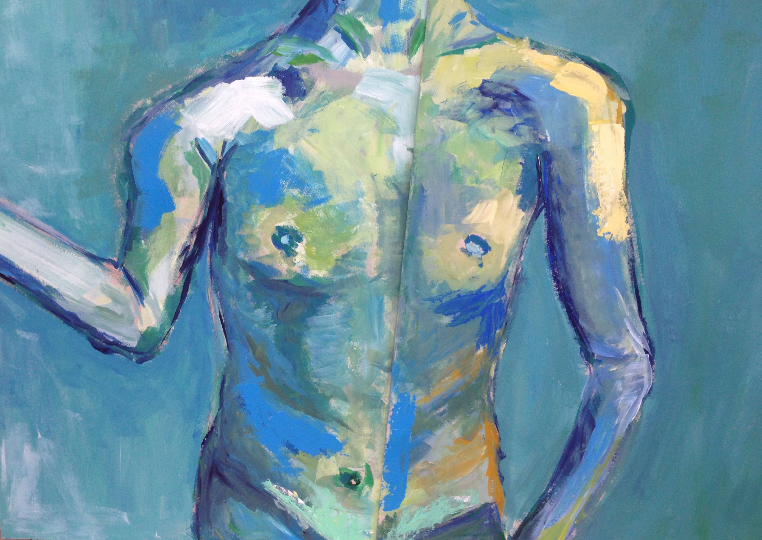 Obraz przedstawia fragment ludzkiego korpusu, który zaskakuje bogatą paletą barw niebieskich, żółtych i zielonych. Kształty ciała są delikatnie rozmyte, co nadaje pracy dynamiczny, niemalże impresjonistyczny charakter. Kompozycja jest minimalistyczna, skupiając uwagę na wyrafinowanej grze kolorów i smugach pędzla. Atmosfera obrazu jest spokojną, ale z nutką tajemniczości. Jakby coś ukrytego miało zaraz zostać odkryte. Styl artystyczny to bez wątpienia współczesny ekspresjonizm, gdzie artysta bawi się formą i kolorem, tworząc dzieło zarówno realistyczne, jak i abstrakcyjne. To one powodują, że obraz przyciąga spojrzenia, zastanawiając nad własnym znaczeniem. Może wywoływać różne emocje - od zachwytu po zadumę, a może i trochę zamyślenia. "Wow, jakie to kolorowe!", mogłoby zawołać dziecko. W tej pracy jest coś niezwykle pociągającego, a zarazem calming. To sztuka, która sprawia, że zastanawiamy się nad współczesnym postrzeganiem piękna i jego różnorodnością. Przyciągają formy, barwy, i ta niesamowita energia, która tętni z tego płótna.