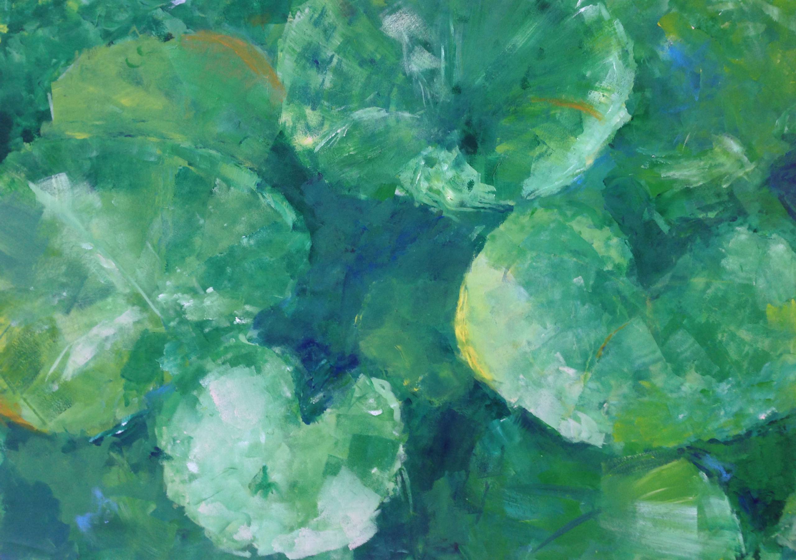 Na obrazie widać eksplozję zieleni. Liście, być może lilie wodne, rozpościerają się niemalże w każdym zakątku płótna. Dominują różne odcienie zieleni, od jasnych, niemal pastelowych, po intensywnie ciemne. Kompozycja jest nieco chaotyczna, choć ujmuje swoją organicznością. Gdzieniegdzie przebijają się subtelne smugi błękitu i żółci, co dodaje harmonii i dynamiki. To jakby las ukrytych tajemnic. Nastrój jest spokojny, ale z nutką tajemnicy. Czujesz, że obraz zaprasza do wejścia głębiej. Trochę jak w spokojący wilderness. Technika artystyczna, wydawałoby się, to akwarela, ale z grubszymi pociągnięciami pędzla, które nadają tekstury. Artysta zastosował impast, co sprawia, że liście wydają się niemal trójwymiarowe. Dzieło budzi we mnie uczucie nostalgii za letnimi dniami nad jeziorem. Może malarz chciał pokazać siłę i piękno natury w jej najprostszej formie. Obraz przypomina mi zabawy w chowanego w ogrodzie. Może trochę longing za czymś nieosiagalnym. Każdy, kto spojrzy, może odnaleźć tu własną chwilę zen.