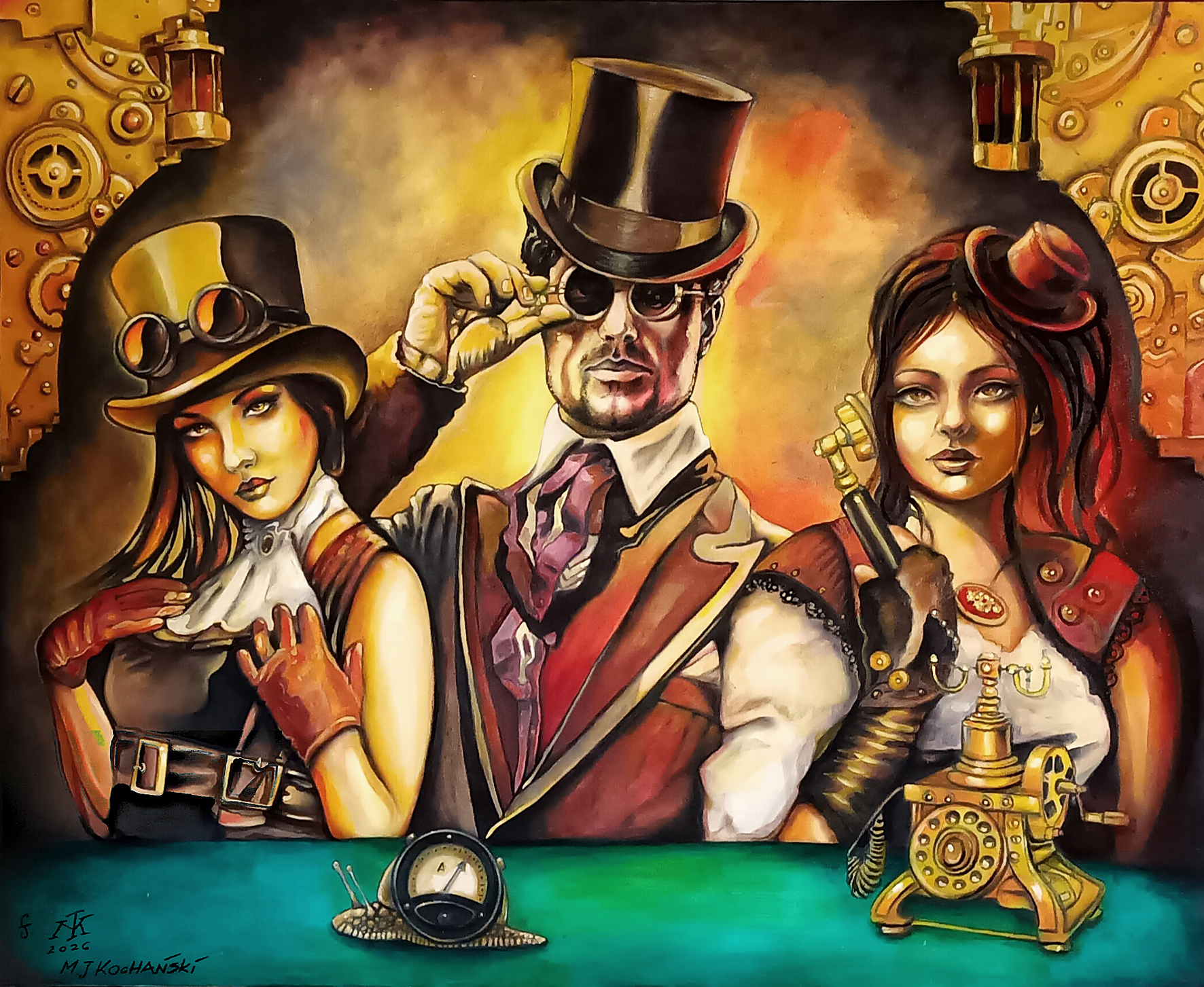 TIME MACHINE CABINET Obraz przenosi widza do świata, w którym elegancja epoki wiktoriańskiej splata się z fantazją technologicznej przyszłości. Trzy centralne postacie – niczym strażnicy czasu – emanują tajemnicą i pewnością siebie. Ich stroje, pełne detali: cylindry, gogle, skórzane rękawice i mechaniczne akcesoria, sugerują przynależność do rzeczywistości inspirowanej steampunkiem, gdzie maszyny parowe i wynalazki wyznaczają rytm życia. Centralna postać, z uniesioną dłonią przy okularach, zdaje się kontrolować bieg wydarzeń – być może sam czas. Towarzyszące mu kobiety balansują między siłą a subtelnością, tworząc napięcie między techniką a ludzką naturą. Tło wypełnione jest złocistymi mechanizmami, trybami i zegarowymi motywami, które podkreślają motyw przemijania i manipulacji czasem. Na pierwszym planie pojawiają się symboliczne obiekty: ślimak z wmontowanym w muszlę amperomierzem oraz ozdobny, niemal ceremonialny telefon – artefakty sugerujące komunikację ponad granicami czasu i przestrzeni. Całość kompozycji pulsuje ciepłymi barwami, tworząc atmosferę jednocześnie nostalgiczną i niepokojącą. „TIME MACHINE CABINET” to wizualna opowieść o kontroli nad czasem, ludzkiej ambicji i fascynacji technologią – zaproszenie do świata, w którym przeszłość i przyszłość istnieją równocześnie.